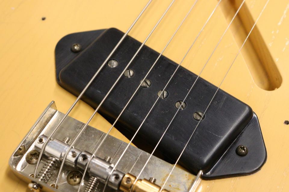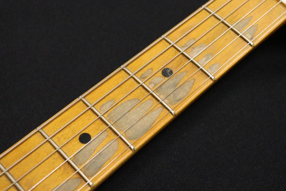 ボディにはミディアムエイジド加工が施されています。手に取った途端に感じるのはその違和感の無さです。丁寧にエイジド処理が施されており、新品ながら手に収まるような感触があります。ウェザーチェックや塗装のチップなどしっかりとしたエイジングが施されていながら、長らく自身が所有していたかのように感じさせる違和感の無さは、工房としてヴィンテージギターに向き合ってきた経験の豊富さと真摯な姿勢が非常に良く表れています。モデルは1本1本エイジドの仕上がりが違い、こちらもRSギターの魅力の1つです。ぜひご体感ください。