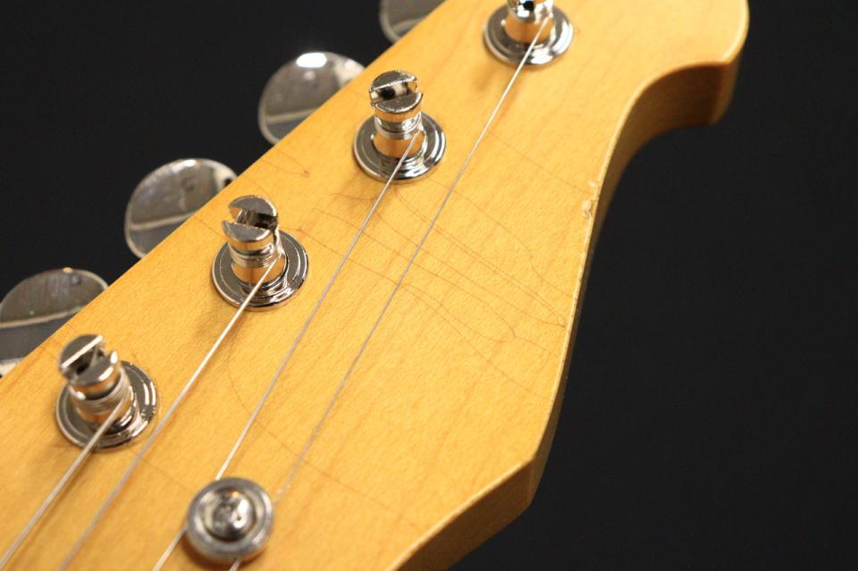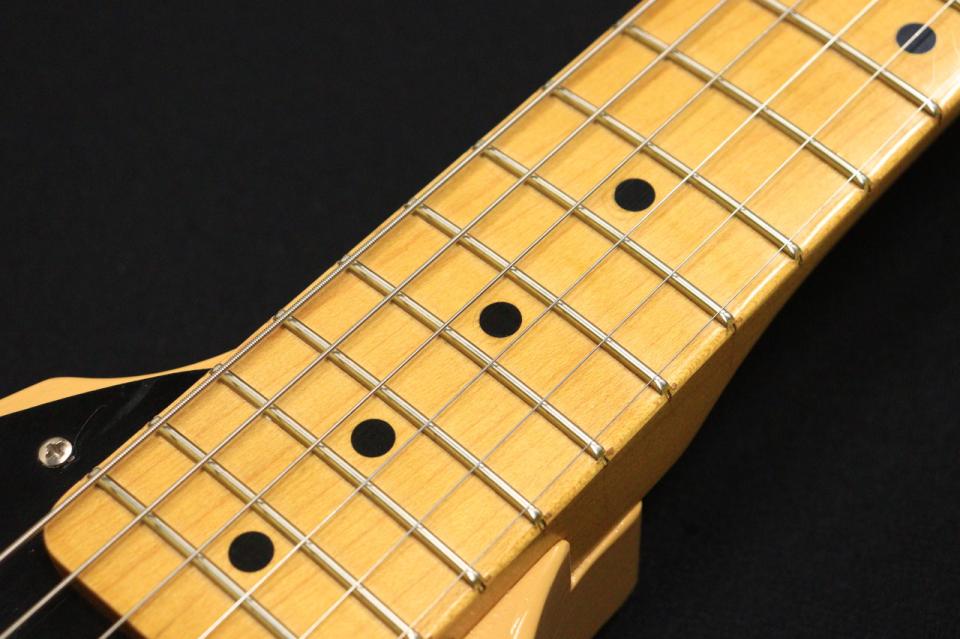 ボディにはミディアムエイジド加工が施されています。手に取った途端に感じるのはその違和感の無さです。丁寧にエイジド処理が施されており、新品ながら手に収まるような感触があります。ウェザーチェックや塗装のチップなどしっかりとしたエイジングが施されていながら、長らく自身が所有していたかのように感じさせる違和感の無さは、工房としてヴィンテージギターに向き合ってきた経験の豊富さと真摯な姿勢が非常に良く表れています。ぜひご体感ください。