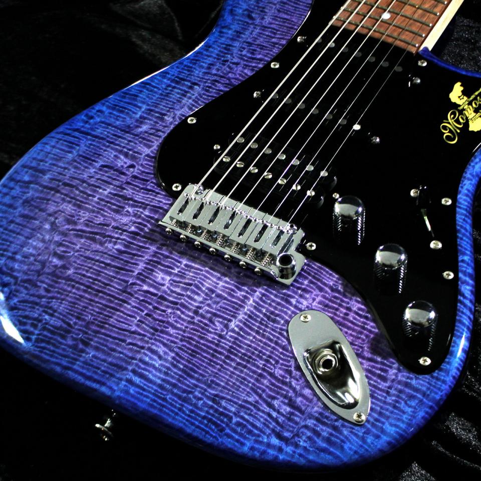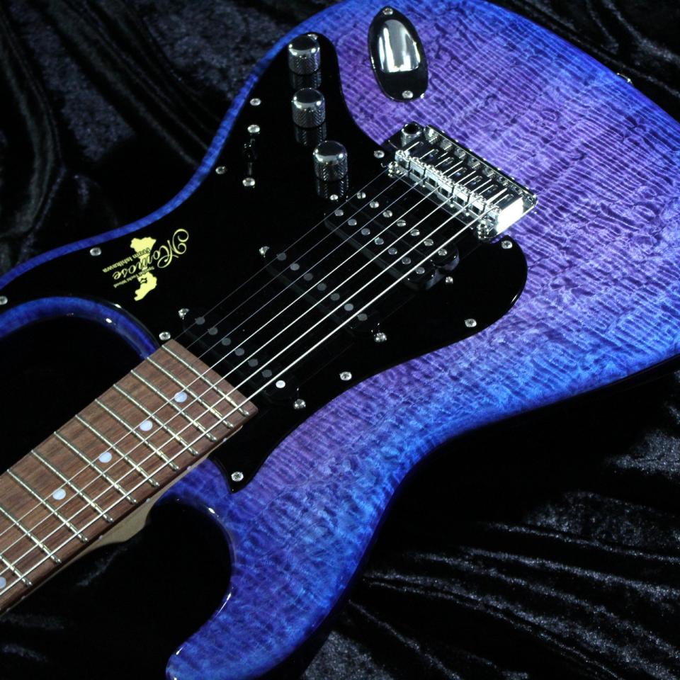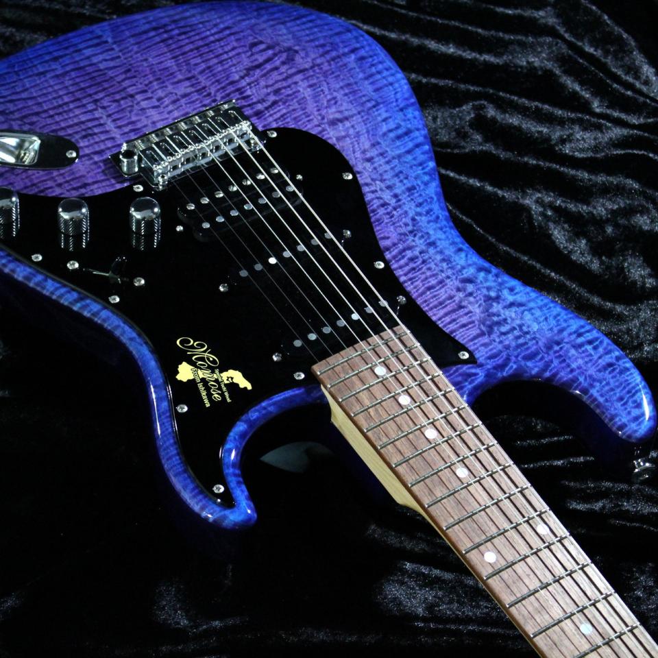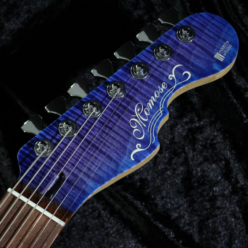 Momoseの7弦仕様モデル”MC7-MV”より、ボディにトチ材を採用した限定モデルが登場。ボディトップには美しい杢目の輝くフレイムトチを選定し、最も相性の良いカラーのひとつであるブルーを基調に、グレーにグラデーションする鮮やかな色味を新たに調色。「SSB(シーサイドブルー)」と名付けられたこのカラーは、美しい浜辺の情景から着想を得ました。