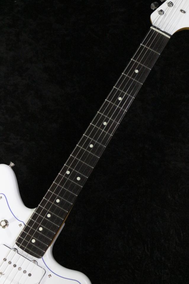 サテン仕様のホワイトなボディに、目を引くブルーのセンターレイヤーを纏った3-Plyホワイトピックガードを搭載しており、ボディとマッチングさせたヘッドに輝くブルーメタルロゴと相まって軽快な雰囲気を醸し出します。