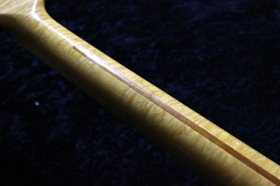 見事な虎杢が入ったフレイムメープル材のネックとヘッド。