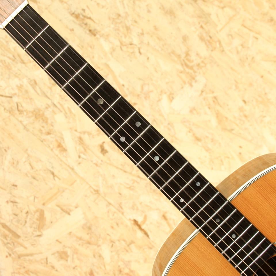 今やワールドスタンダードとなっている"D-28"と並びマーチンを代表するもうひとつの顔的モデル、トリプルオーサイズのロングセラーモデル"OOO-28"。本器は1990年製USED品。シトカスプルーストップ、ローズウッドサイド&バック、エボニー指板&ブリッジ、シャーラーロトマチックペグ、MOP指板ドット、スクエアロッド、ブラックピックガード、チェッカーフラッグバックストリップ、ノンスキャロップドXブレイシング。OOO-28は2018年に大きく仕様が変わり、よりオールドテイストを取り入れた姿へと変化しました。2025年にも細やかな個所が変更されゴールデンエラ期に近づいた特徴を与えられています。本器はそれらの変更が入る前の旧仕様かつ70-80年代に通じるSQロッドを備えた個体。ナット幅は現行品と異なり42.9mm、ブレイシングはノンスキャロップ、ペグはシャーラ―のロトマチックタイプ。現行品のナット幅が広く握り込みにくいと感じられる方には一度体感して欲しいネック、親指を使った押弦にも対応しやすいグリップ。この仕様を探している方が一定数おられることにも納得です。そしてノンスキャロップブレイシングの為にトップ面の強度が高くなり、より粒立ちの揃ったバランスの良いサウンド。そしてやや太いサウンド、音の輪郭も出しやすく制御しやすい辺り細かいニュアンスを表現できる可能性をもっています。ペグ自体も重量がある為に重たい響きとスーッと伸びるサスティーンを生み出しやすく、音を切る、伸ばすの加減も演奏者次第。自分が思い描く演奏へ応えてくれるであろう世界のスタンダードモデル。プレイスタイルも特段選ばず、ストロークでのパワフルなサウンド、フィンガーでの繊細な響きを堪能できる1本です。ボディトップ面ブリッジより下部、6弦側ショルダー付近、ピックガード上部に細やかな当てキズが見られ、ブリッジ下部には細やかなウェザーチェッキングが見られます。その他にはピックガードや全体的に極々薄い擦れキズ等が見られますが、それらを踏まえても25年近く経ている個体としてはキレイな状態。ネック周りの演奏性も良し、サドルでの弦高調整幅を残しており、現状標準的な弦高に整えられています。ロッド残りもある為、これからも使っていけると感じさせてくれる個体。マーチンを代表するモデルの1つ、もう一つのワールドスタンダードとも言える28です。現行品のナット幅が合わなかった方には是非一度お試し頂きたい1本。お探しだった方はお早めに。