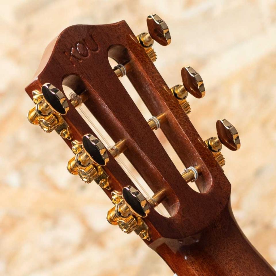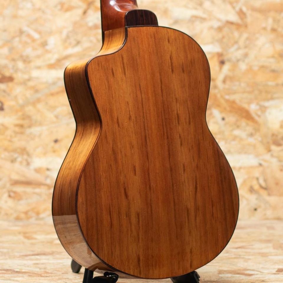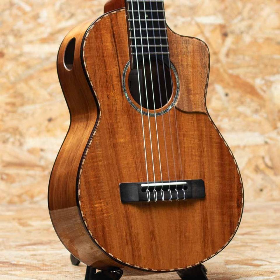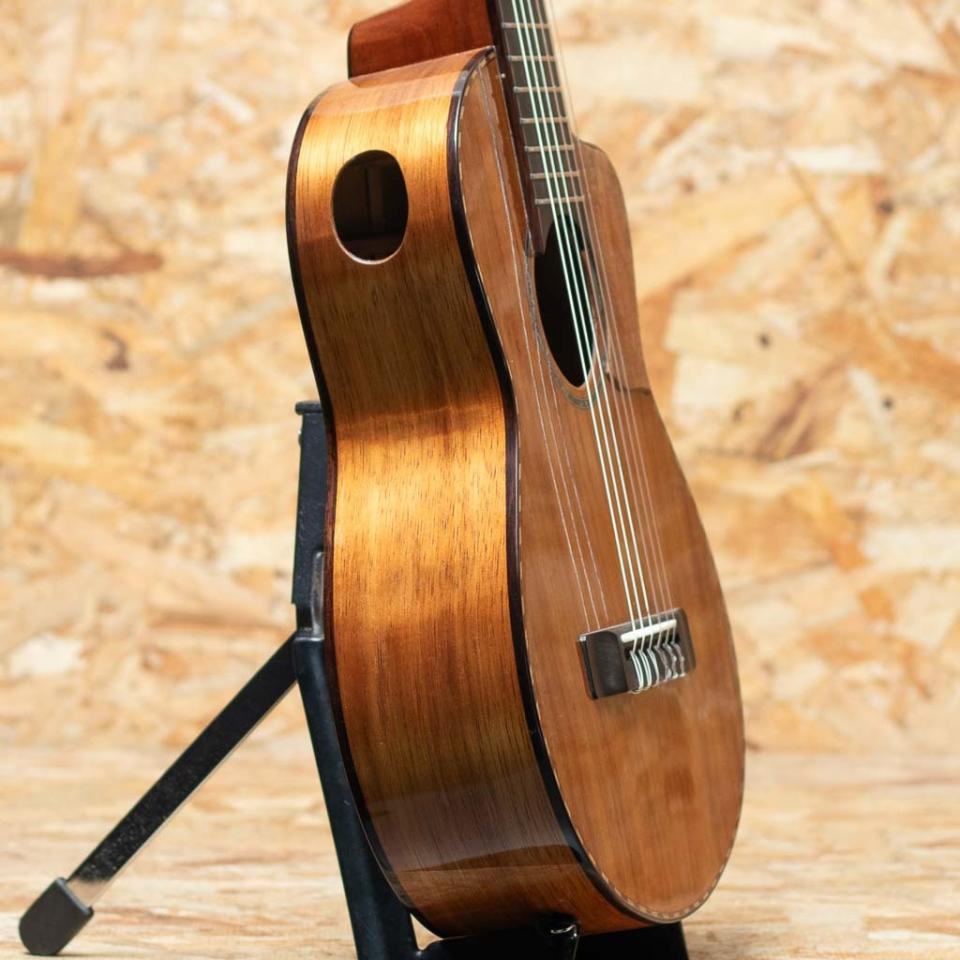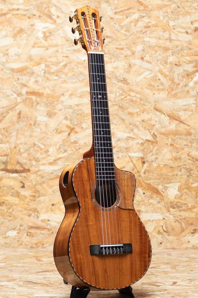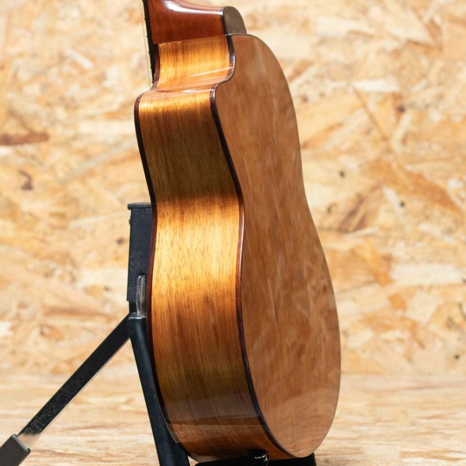 1998年茶位幸信氏に師事し、工房にて12年の修行を積み、ギター、ウクレレの製作技術を習得。2010年満を持して独立を果たした古林達郎氏。クラシックギターの原点といえるトーレスの製作方法などを研究し、ウクレレに活かした構造はこれまでのウクレレのイメージを払拭した音色で、コアなウクレレファンを唸らせています。”KOU”というブランド名は持っていただいた方に「幸せ」な気分になってほしい、という思いで名付けられたとのこと。本器はハワイアンコアボディで製作していただいたミニギターモデル”BEDK”。マホガニーネック、エボニー指板&ブリッジ、ハワイアンコアピックガード、サイドサウンドホール、ベネチアンカッタウェイ、スロッテッドヘッド仕様。48ミリナット幅に512ミリの弦長を持つこちらのモデルはレギュラーチューニングでもギタレレチューニングでも対応出来る絶妙なサイズ。良質なハワイアンコア材を使用しており、見た目も美しく、安定性に優れた明瞭なサウンドを大音量で響かせてくれます。サウンドポート、フローレンタインカッタウェイ付き仕様で音響特性、演奏性にも長け、バーサタイルにお使いいただけるモデルとなっております。汎用ギグケース付き。
