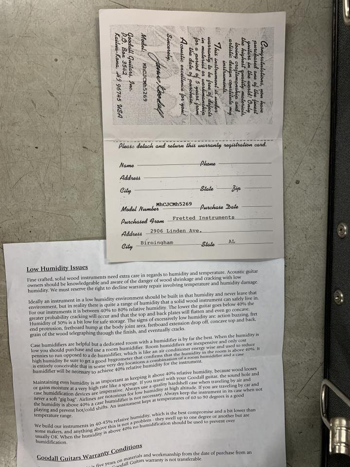 Goodall Guitars Mahogany Concert Jumbo Cutaway Mahogany Top Guitar 25.5" scale 1.75" nut width model/serial number: MhCJCMh5269 (completed on October 23, 2007) This guitars' fine features are listed below: