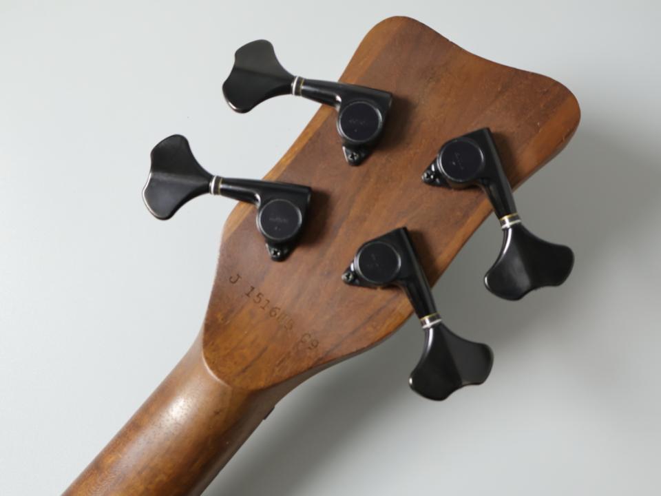 ネックは多少のハイ起き気味ではありますが、現状弦高が4弦側 約2.5mm、1弦側で2.0mmのセッティングになっており、まだまだ下げる余裕もございます。フレットは8割以上残りがございます。ペグがゴトーに交換されております。