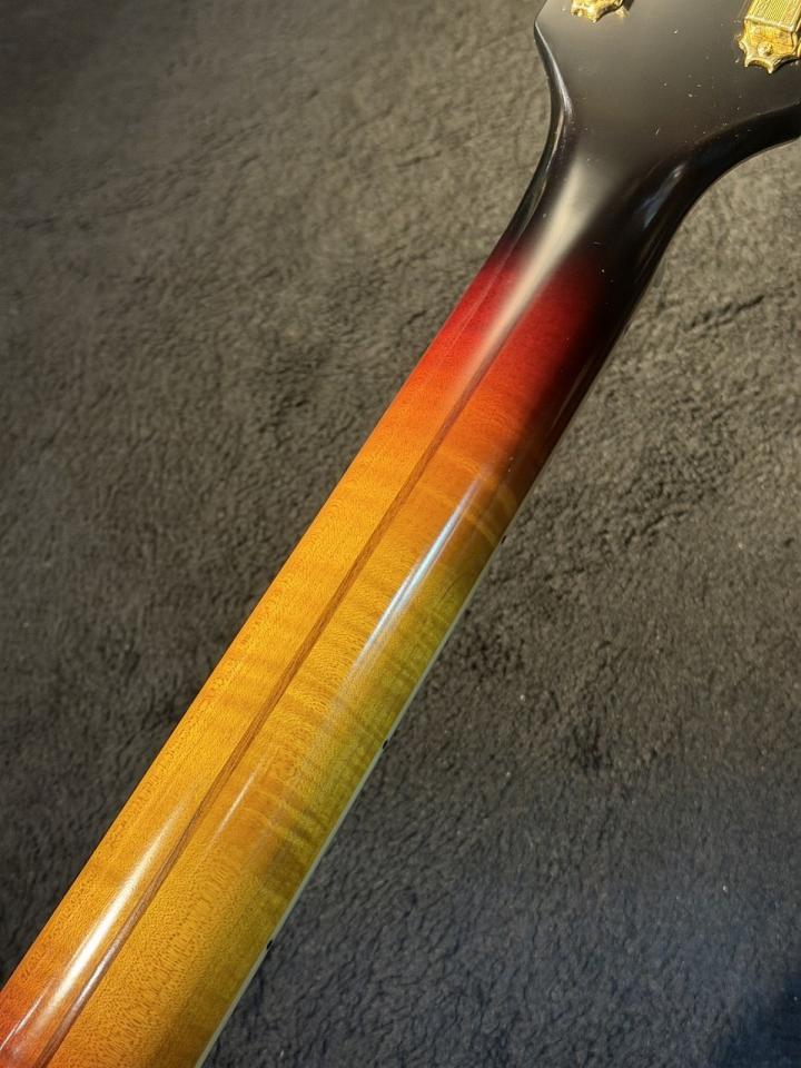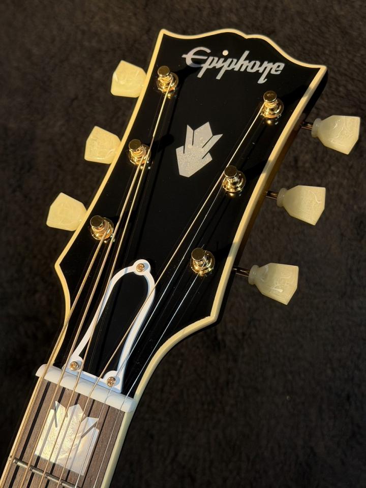 ギブソンと同デザインの“オープンブック形”ヘッドストックにはバインディングが巻かれ、マザー・オブ・パールのエピフォン・ロゴとギブソンのクラウン・インレイが埋め込まれています。