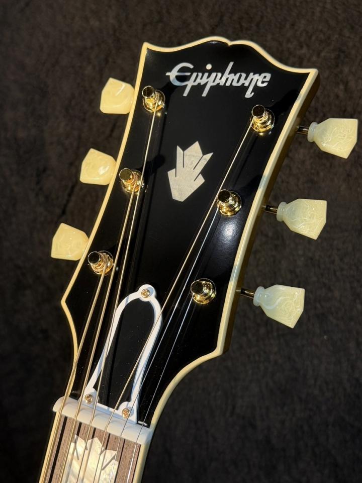 ギブソンと同デザインの“オープンブック形”ヘッドストックにはバインディングが巻かれ、マザー・オブ・パールのエピフォン・ロゴとギブソンのクラウン・インレイが埋め込まれています。