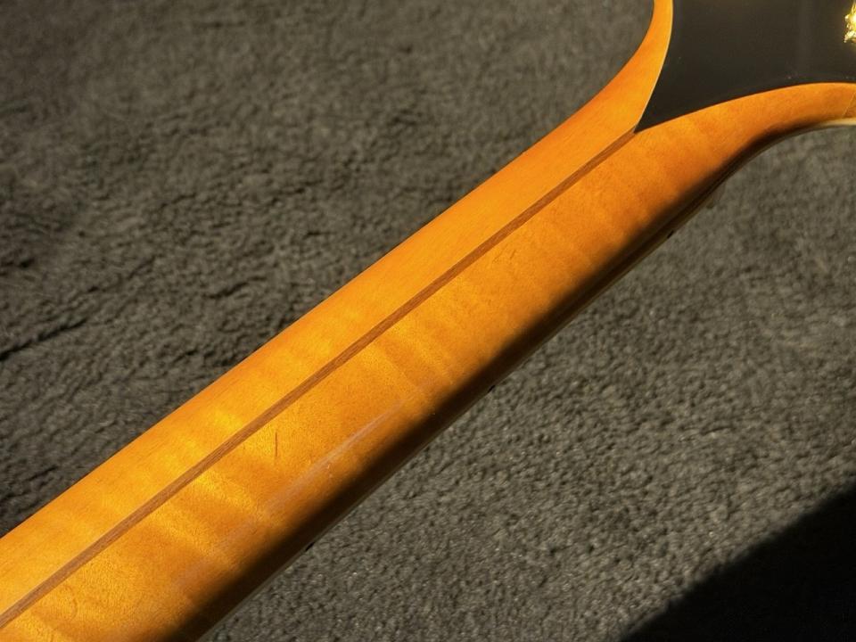 ネックはウォルナット材のストリンガーを挟んだフレイム・メイプルによる2ピース構造で、Cシェイプ・プロファイルを採用。指板にはバインディングが巻かれたインディアン・ローズウッドが使用され、マザー・オブ・パールのクラウン・インレイと20本のスタンダード・フレットが配置されています。