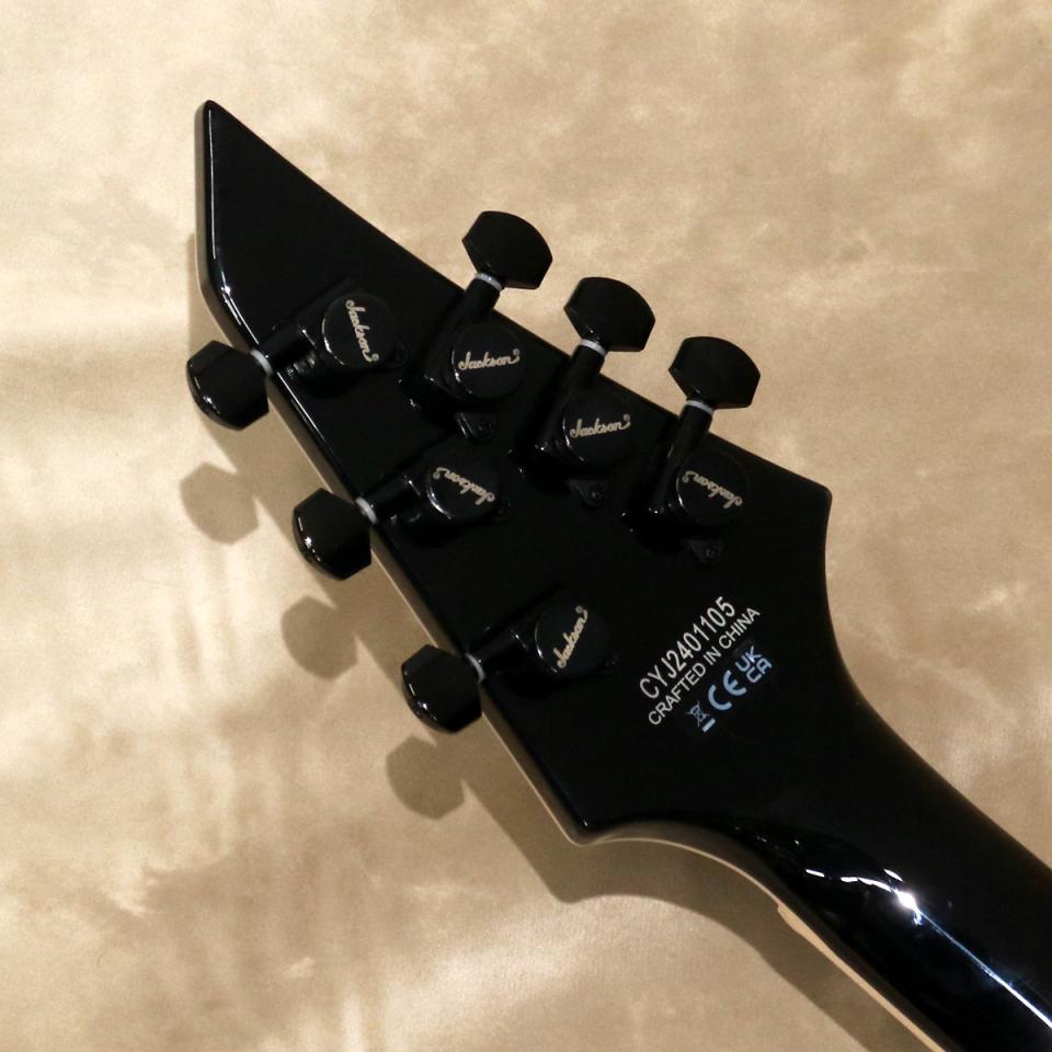 斬新なパープルミラーフィニッシュに、白/アバロン/白3プライのボディバインディング、オールブラックのハードウェア、リバースタイプのジャクソン3x3 AT-1ブラックヘッドストックを採用しています。