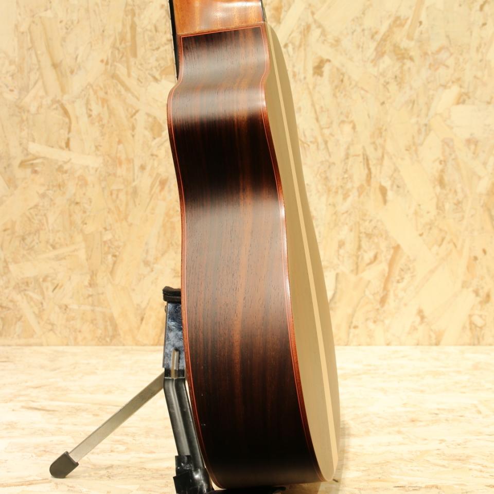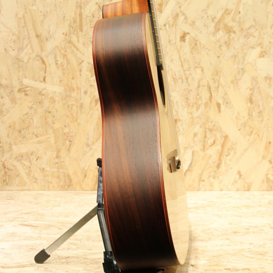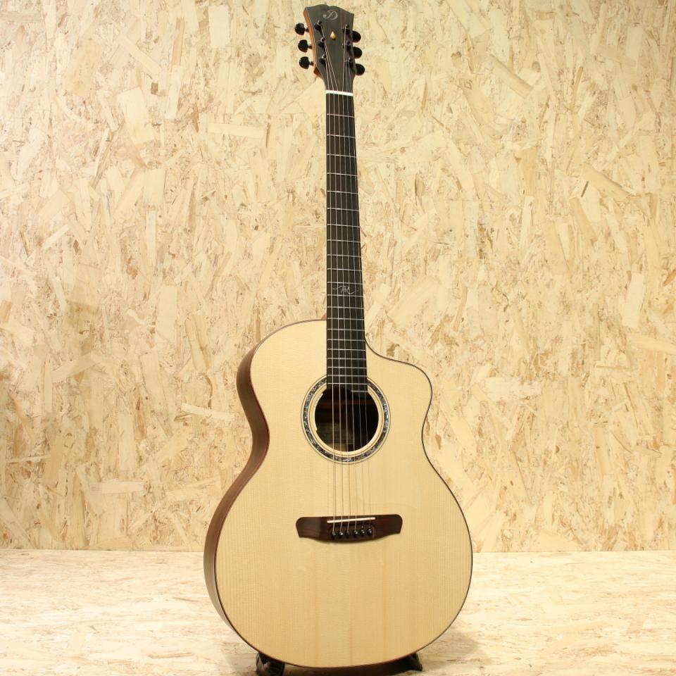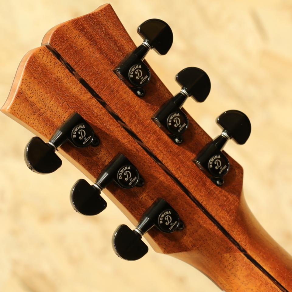 東欧のスロバキアに工房を構えるギターブランド"Dowina(ドウィナ)"。その中でも古くは琥珀を運ぶ貿易網であったアンバーロード、その中継地点にスロバキアがあったことにあやかりネーミングされた”Amber Road”シリーズ。本器はグランドオーディトリアムサイズ”GACE-ds”。2020年代製のUSED品。ドロミテ・スプルーストップ、インディアンローズウッドサイド、インディアンローズウッド&メイプル3Pバック、カヤマホガニー&ウェンジネック、エボニー指板、エボニーブリッジ、クリアピックガード、45mmナット幅、カッタウェイ&L.R.Baggs Anthem搭載。トップは艶のあるグロス仕上げ、ネック裏とサイド&バックは艶無しサテン仕上げの仕様。北欧のヨーロピアンブランドだけに近い国々のブランドと似た仕様を持っているところに、製作理念のようなものを感じさせます。ナット幅は45mmとなっておりフィンガースタイルにも対応し易くなっており、カッタウェイの搭載によってポジションを問わない演奏性を獲得。どちらもソロギターでは嬉しい点でしょう。ヘッドにはアンバー(琥珀)のようなものが埋め込まれており、シリーズ名にちなんだ外観となっています。更に特筆すべき点はトップ材のドロミテスプルース。北イタリアはアルプス・ドロミテ地方で産出される材で、古くから弦楽器の表板として使われ、ストラディバリがこの木を使っていたことでも知られています。そしてクラシックテイストを感じさせる、低音の落ち着いている出方と高音弦の抜け方が気持ち良いトーン。やや奥ゆかしさを感じる音色、ボワつかず、ややタイト気味に音が立ち上がります。それでも箱で増幅している感覚やオープンなトーンも持ち合わせており、出過ぎている帯域が無いところにバランスの良さを感じられます。仕様やサウンドからフィンガースタイルプレイヤーに好まれそうな、ヨーロッパブランド特有の音色を持ちつつ演奏性の高い1本。L.R Baggs Anthemピックアップシステムを製造時に搭載。クッキリとした音像を拾えるピエゾ、そこにボディの空気感を拾えるマイクを足して出力できるシステムです。任意でマイクのミックス具合を調整でき、ソリッドなピエゾサウンドから空気感のある自然なサウンドまでその場に応じて可変出来る優秀なシステムです。ボディトップ面6弦側のボトム箇所、トップ面の指板6弦側横、ブリッジ1弦側下部に若干の当てキズが見られるのが惜しい点、全体を通しても使用感は少なく状態の良いまま保たれた個体。ネック周りの演奏性も整えられ、フィンガースタイルの要望にも応えられるであろう弾きやすい1本です。生での演奏からラインサウンドまで。拘り派の方にも満足して頂けるであろう優秀なギター。金額を考えると非常にコストパフォーマンスの良いUSED品です。是非ご検討下さいませ。