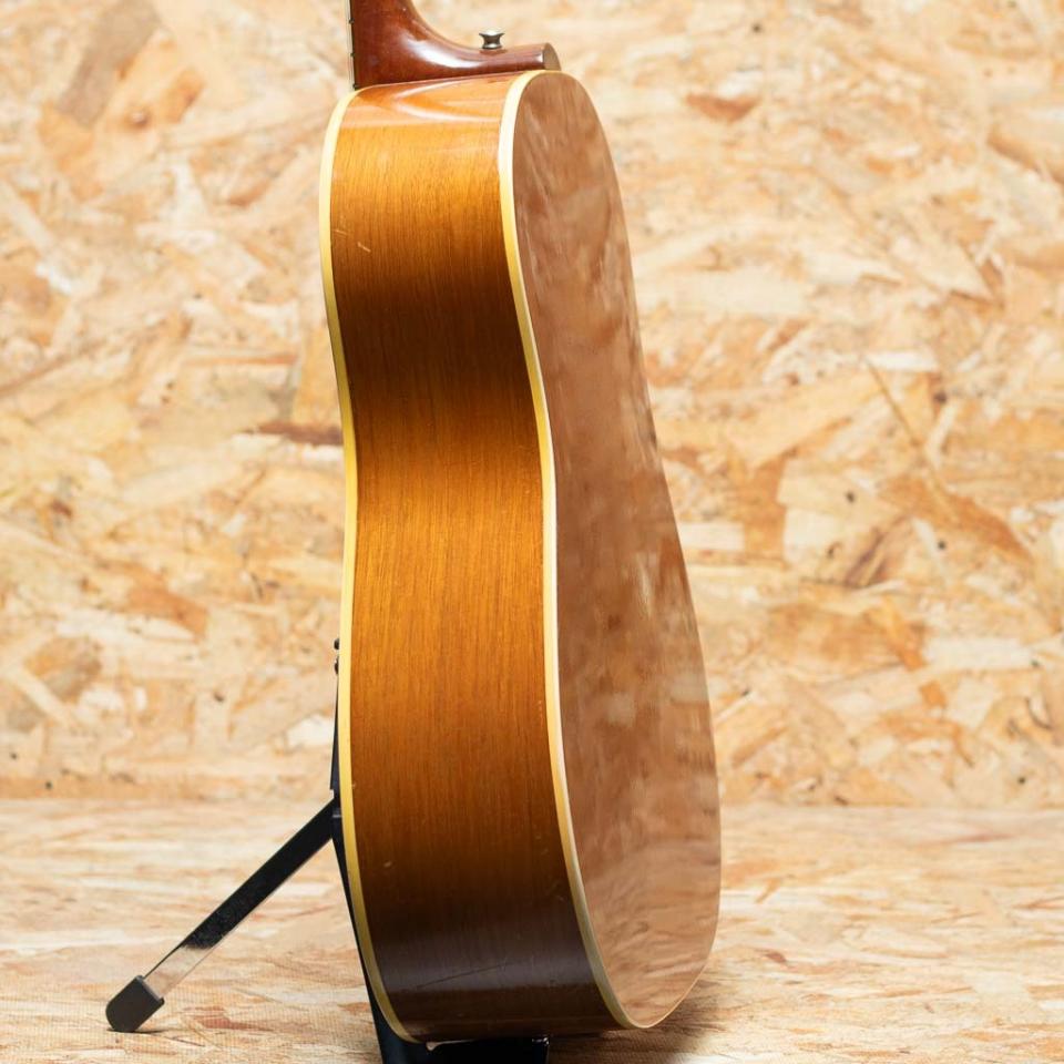 ギブソンフラットトップの顔、ワーキングホース"J-45"。ギブソンを代表する45と対をなす存在のナチュラルトップラウンドショルダーボディのジャンボモデルが本器”J-50"です。"J-45”を追う形で1947年に登場した”J-50”。本器は1959年製の1本。スプルーストップ、マホガニーサイド&バック、マホガニーネック、ハカランダ指板、ハカランダブリッジはロングサドル仕様のものにリプレイス、シングルライン3連クルーソンペグ、シングルリングロゼッタ、ポインテッド・シン・ラージガード、ノンスキャロップド・Xブレイシング。握り心地がありながら太すぎない、特に人気の高い59ネックシェイプ。オリジナルビンテージならではの泥臭いサウンドは、掻き鳴らせばロックに、爪弾けばノスタルジックに聴かせてくれます。サウンドホール上下に裏からパッチを当てたクラック修正跡、ボディサイドのバインディング付近にもクラック修正跡が見られるほか、ボディトップ面の変形、打痕や塗装の剥がれ等使用感は多めの状態。ボディ全体にオーバーラッカーが施されており、ボディバック面の一部には塗装の反応が見られます。ネックヒールにストラップピン増設済み。ネックコンディションは問題なく、弾きやすいアクションをしっかりと保っています。全体にウェザーチェックが入った経年を感じさせるルックス。貫禄のナチュラルトップを魅せる”J-50”。是非お手元でお楽しみください。ハードケース付属