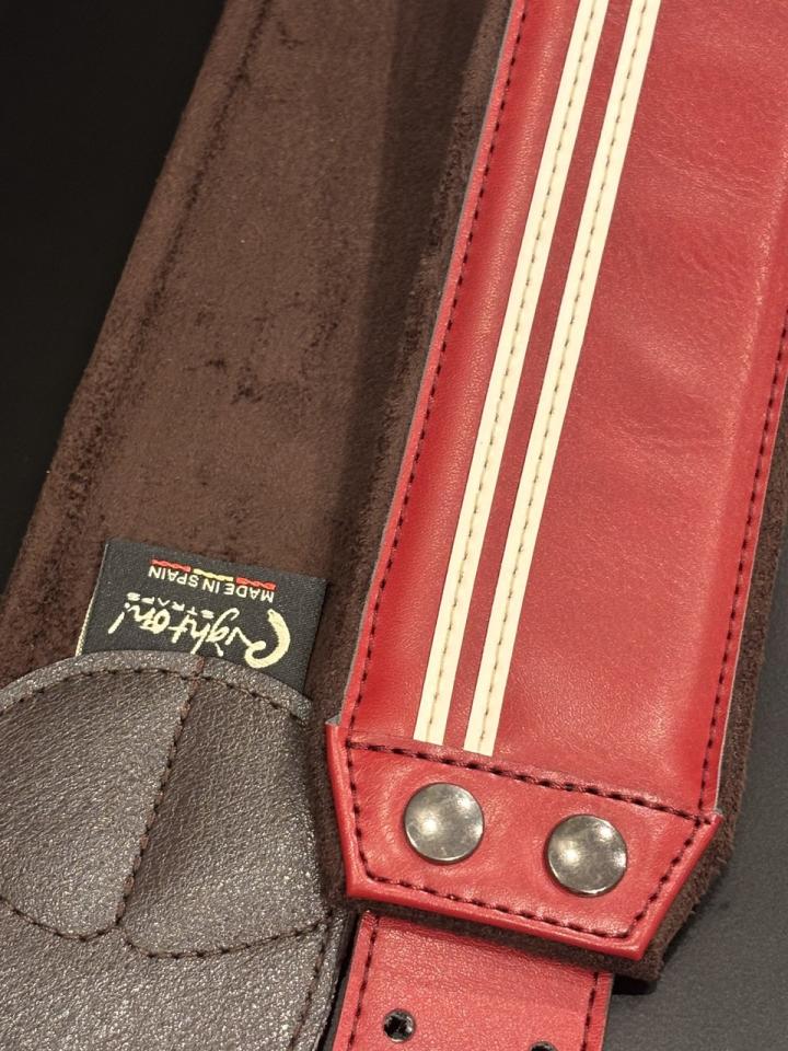 鮮やかな発色の良い素材にレーシングラインが走ったクラシカルなデザインのストラップです。