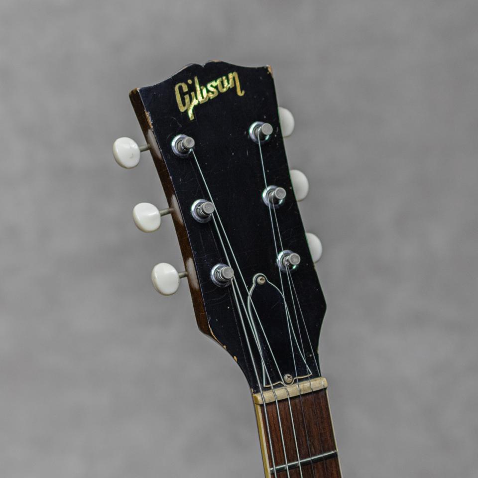 "ES-330"は1959年に登場。"セミアコ"の代名詞ともいえる"ES-335"と同じダブルカットのシンラインボディ形状を持ちつつ、センターブロックを置かないフルホロウ構造を採用、同スタイルのEpiphone版である"Casino"と並んで広く愛されてきました。本器は1967年製"ES-330TD"、60年代らしい淡い色合いが魅力のSunburstカラー。マホガニーネック、ローズウッド指板、スモールブロックインレイ、クルーソン2ラインペグ、メイプルラミネートボディ、16フレットジョイントの"ショートネック"、P-90、ドッグイヤークロームメタルカバー、ブランコテールピース。ネックスケールは約628㎜の通常のギブソンスケールであるものの、登場の1959年~1969年頃まではネックジョイントが16フレット位置で設計されており、ローフレットが手元に近い通称"ショートネック"と呼ばれます。手に取りやすい軽さ、小回りの利くデザインはギターボーカルにも抜群。その後"ES-335"と同じ19フレットジョイントに変更されますが、比べるとネックジョイントが深い分、サウンド的にもより豊かなミッドの飽和感、甘い響きが強く感じられる点もこちらの仕様の魅力です。程よく枯れたドライな生鳴りとエアー感豊富な響き、アンプからの出力もヴィンテージらしい弾き応えのある心地よいレスポンスで、豊かな倍音感を持ちつつも子気味の良い軽快さで楽しませてくれます。こちら全体に塗装チェッキングが入った雰囲気の良い経年具合。リアピックアップがSeymour Duncan製P-90タイプに交換されているものの、フロントピックアップ、ボリューム&トーンポット、コンデンサ等はオリジナルをキープ。フレットの減りも60~70%程と年代相応に見られるものの、ローアクションで気持ちよくお楽しみいただけるネックコンディションをキープしています。その他商品コンディション詳細等はお気軽にお問合せくださいませ。ハードケースが付属。