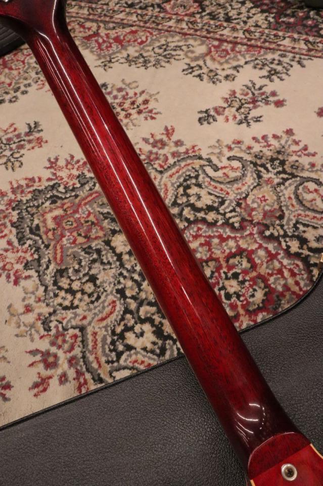 メイプル/ポプラ/メイプルの3プライ・ボディにシャープなホーン・カッタウェイとスモールFホール、1プライのロイヤルライト・バインディング、オーセンティックなSixties Cherryカラー、ダブルリングのペグ、シルバーインサートのハットノブ、ブラック・ショートピックガード、軽くエイジド加工されたハードウェアが特徴。マーフィー・ラボのウルトラライト・エイジド・フィニッシュ加工は、数十年にわたる演奏による磨耗をシミュレートしています。64年製ミディアムCプロファイルのソリッド・マホガニー・ネックは、非常にスムースで心地よく手に馴染み、インディアン・ローズウッド指板に22のミディアム・ジャンボ・フレット、スモール・ブロックのニトロセルロース・インレイが施されています。