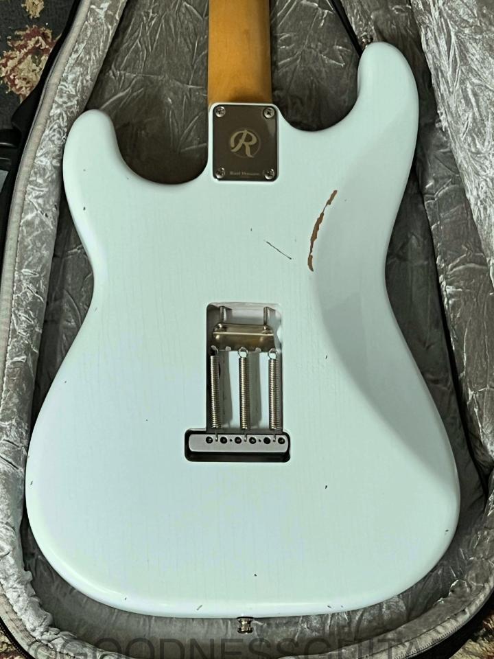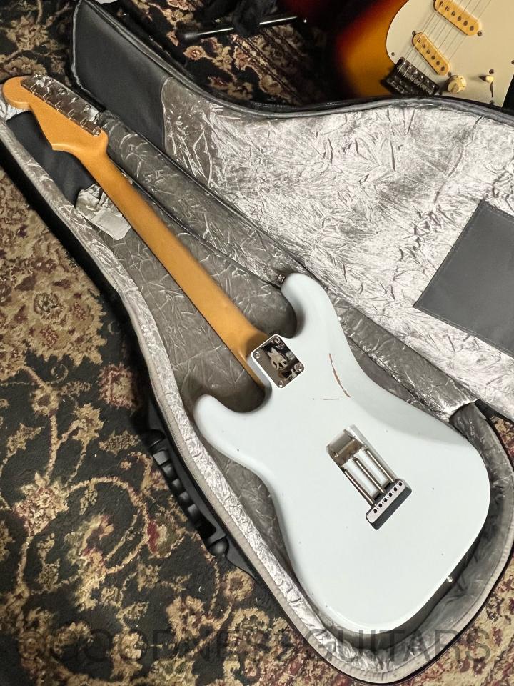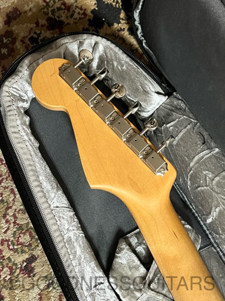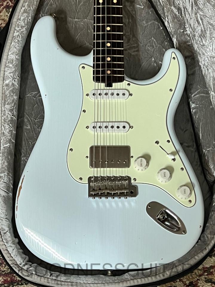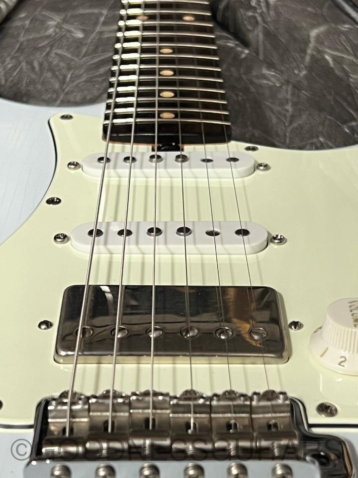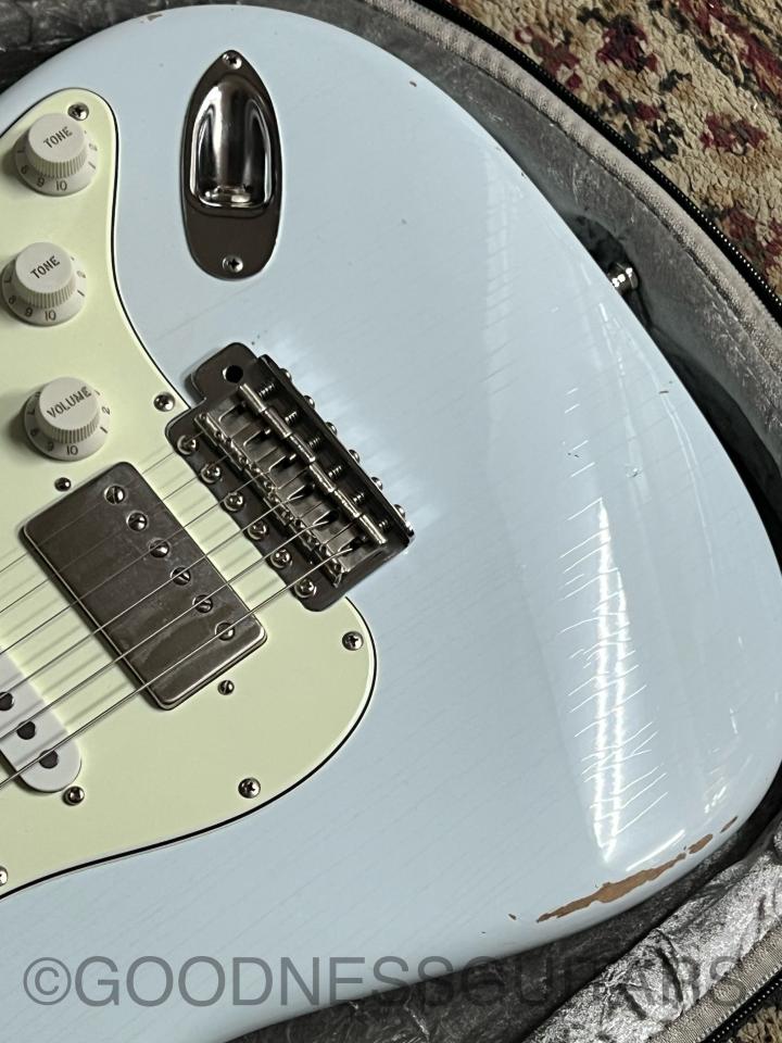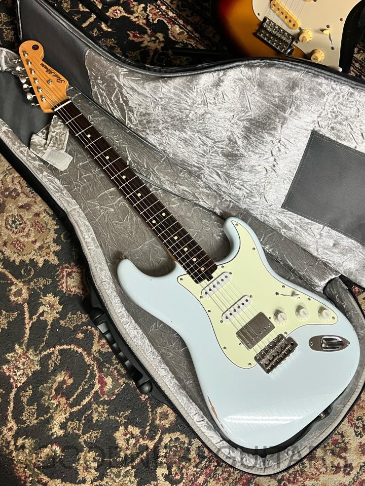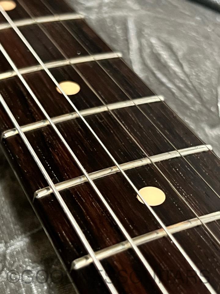 ソニックブルー感のある爽やかな薄い青にウェザーチェックが良いルックスをしております。フィンガーボードはブラジリアンと思われます。指板サイドはロールされヴィンテージ感が出ていますね。