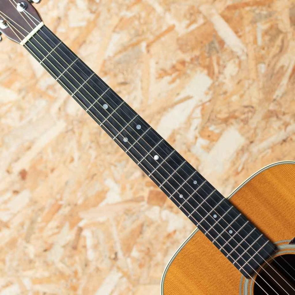 マーティンギターの中で最も有名なモデルといえば、この”D-28”。1931年の発表以来、マーティンを代表するモデルとして世界中のプロミュージシャンから愛され続けているワールドスタンダードモデルです。本器は1963年製の"D-28"VINTAGE品。スプルーストップ、美しい柾目杢ハカランダサイド&バック、マホガニーネックロングサドル、パテントミルクボトルグローバーペグ、ハカランダ化粧板、MOP指板ドット、スチールTバーロッド、スモールメイプルブリッジプレート、ノンスキャロップドXブレイシング。ネック裏はオーバーラッカー、トップはリトップされており、またボディはリフィニッシュされています。それに伴いバインディングはアイボロイドにてリプレイス。ネック周りのコンディションはとても整っており、快適な演奏性をもったグッドコンディション。手が入っている箇所は多いものの、見事な技術によって極力Vintageの雰囲気を損なわないように丁寧で緻密な補修がされています。また、近年では極めて入手困難なきめ細かく美しいサイド&バックのハカランダは圧巻。ハカランダらしい硬質で重厚、レンジの広いダイナミックな響きもしっかりと楽しめます。是非お手元でガンガン弾いて、かき鳴らして、ご体感くださいませ。汎用ハードケース付属
