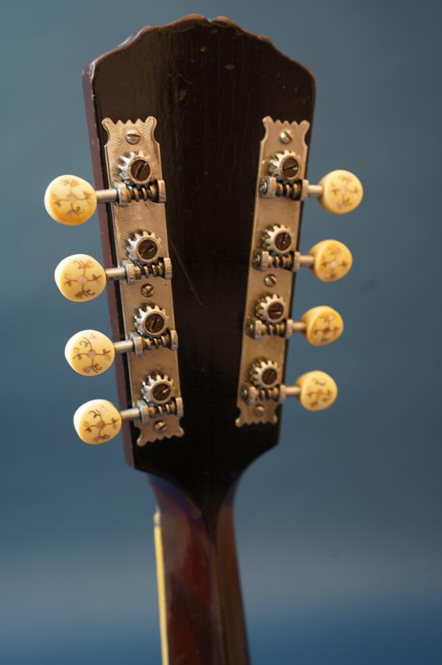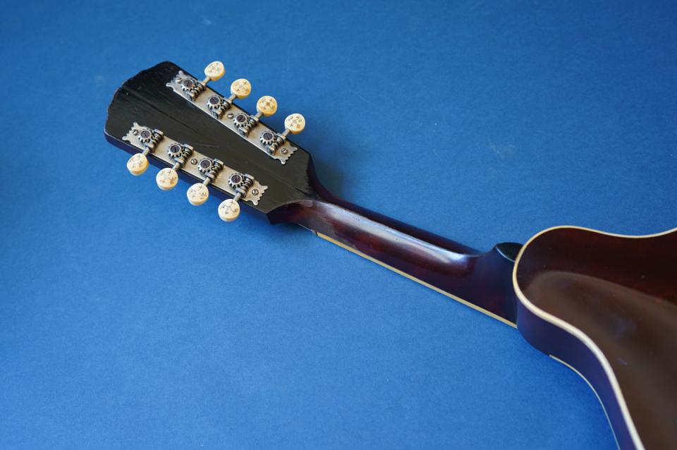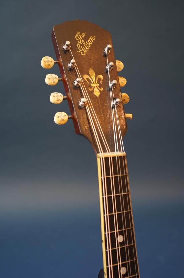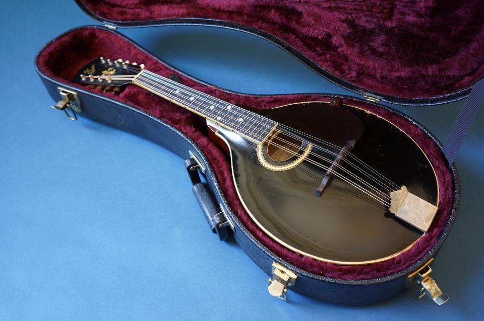 ギブソン製のティアドロップ型マンドリンの最上位機種A-4。ハイエンドモデルの証とばかりに施されたヘッドやペグのツマミのインレイ、この時代特有のビンテージ感漂うブラックフィニッシュなど、現代では再現出来得ない独特の雰囲気を持った一本です。