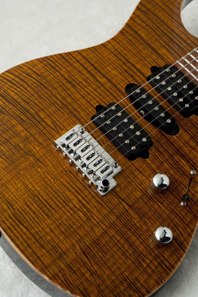 マテリアルはボディにバスウッド、ボディトップにはフレイムメイプル、ネックにはローステッドメイプル、指板にはパーフェローとなっております。
