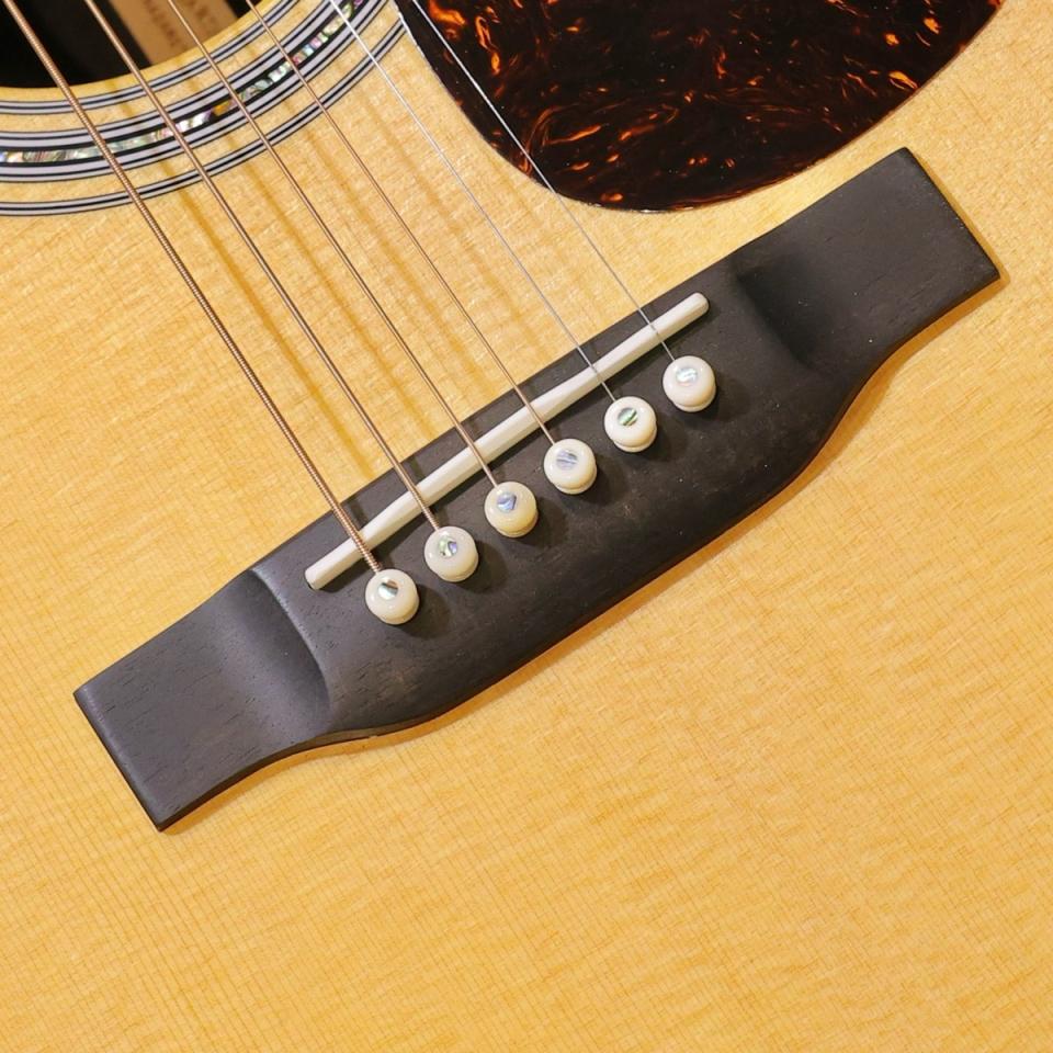 本機はドレッドノート・ボディを基盤に設計され、トップには厳選されたソリッド・スプルースを採用。明快で反応の良い響きを実現し、ストロークでもフィンガースタイルでも高い表現力を発揮します。バックとサイドにはイースト・インディアン・ローズウッドを用いており、豊かな低音と厚みのある中音域、そして倍音豊かな広がりを備えています。ネックはマホガニーで、強度と快適なグリップ感を両立。スケール長は645mm、ナット幅は1約44.5mmで、14フレット接合・20フレット仕様により、幅広い演奏スタイルに適応します。