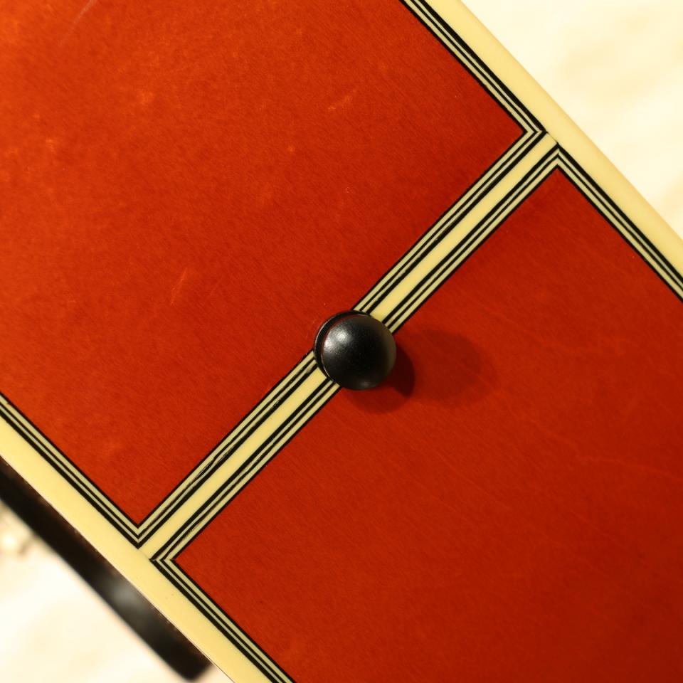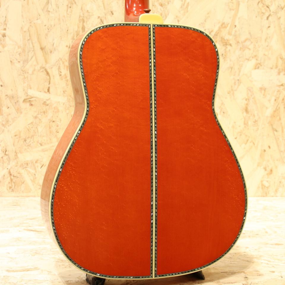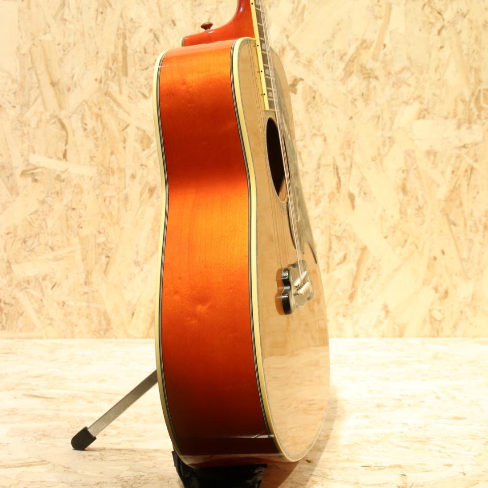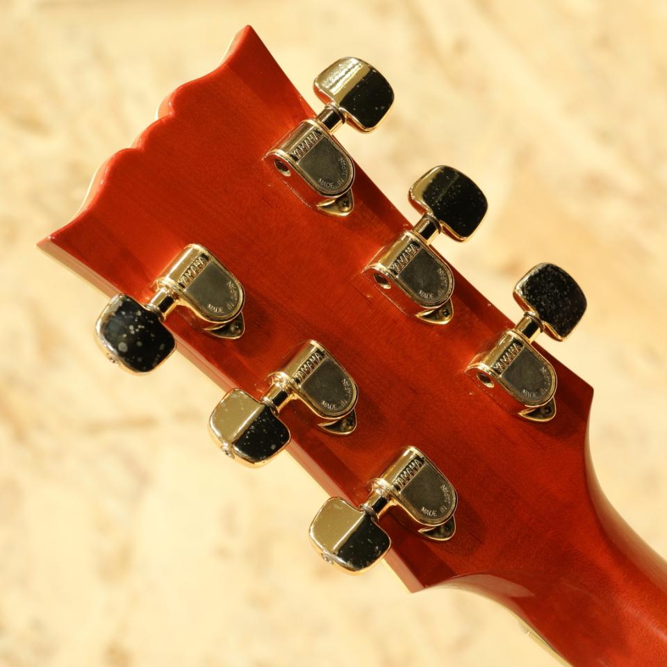 FGの上位機種として1974年にL-31を発表して以来、時代のミュージックシーンを彩り、数多くのアーティストやギターファンに愛されているLシリーズの人気モデル。1975年11月から1980年まで販売されていたL四天王(L-51、L-52、L-53、L-54)と呼ばれているギターのひとつで、ヤマハアコースティック史における非常に重要なモデルといえます。L-54はギブソンのダブを彷彿させるルックスで最もファンシーな位置付けでした。高級スプルーストップ、高級メイプルサイドバック、メイプルネック、エボニー指板&ブリッジ、ホトトギスがモチーフとなった彫刻ピックガード、ロゼッタとボディートップバックとヘッドプレートにはバイアスのシェルパーフリング、トリプルparallelogramのMOP指板インレイ、MOPモチーフブリッジインレイ。程よく褐色のナチュラルスプルーストップに朱色に着色されたサイドバックカラー。重量もあり、音色も重心が低くパンチの効いた立ち上がり。粘りのある倍音にエッジの効いたサウンドでクリアでトラディショナルアメリカンブランドには全くない方向性のサウンドはヤマハの存在感を示したまさに四天王の一つ。何より圧倒的に目を惹くデザインに魅了されます。サウンドホール周りのいくつかの弾き傷など一部の使用感はありますが、全体的にも薄くウェザーチェックが見られる程度で大きく目立つ傷などはなく使用感の大変薄い素晴らしいコンディションをキープしています。エンドピンはジャックサイズに拡張されていますが現在ピックアップは取り外されており、ウッドの同型のピンが取り付けられています。ヒール部分にストラップピンマウント。ネックのコンディションも良好でとても弾きやすいアクションをキープ。サドルの出代も十分で調整幅も十分あります。L-54は市場でも極端に少なく、コレクションをそろえたい方は必見の一品。オリジナルのブラウンケース付属です。