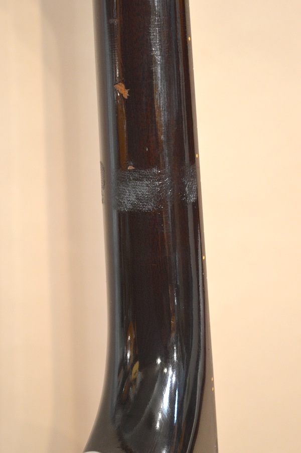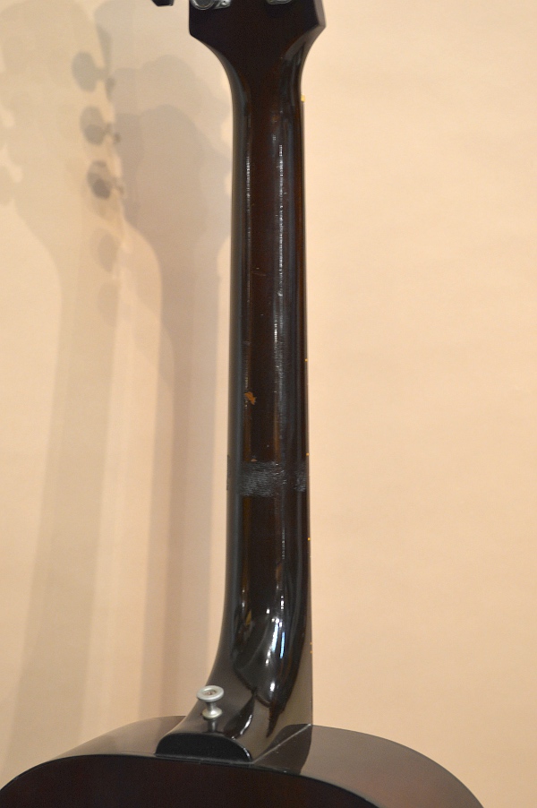 楽器のコンディションは、年式なりのキズや使用感、経年感やちょっとした修理歴などありますが、致命的なキズやダメージは無く、弾く楽器としては上々のコンディションを保っています!まず修理歴としては、1弦側ボディー・サイドのウエスト部に6cmほどのクラック修理があります。現在はがっちり接着されていますが、過去に流動性の高い接着剤を流し込んだようで、ボディー内部を覗くと木部にシミのような跡が広がっています。当店入荷時にはまだ完全には修理出来ていなかったので、改めて接着修理しました。内部からは補強のクリートは打ちませんでしたが、割れ止めのテープもあり、しっかり接着されていますので、強度的な心配はありません。その他に気になりそうな箇所としては、7フレットのネック裏に帯状の塗装の荒れがあり、その上に1cmくらいの塗装のチップがあります。ストラップでも巻いていたのか?繊維状の跡が残り、手触りもガサツキを感じますが、演奏上はそんなに気になる程でも無いかと思います。その他にも弾きキズや擦り傷等散見出来ますが、キズに関しては年代の割には少ない方かと思います。また、光にかざしてよくよく見ると、ヘッド裏のシリアル・ナンバーの下に以前の所有者のお名前と思われるうっすらとした刻印が見えます。言われなければ気付きもしない程度のうっすらとしたモノなので、まぁ別段どうと言う事も無いでしょう。