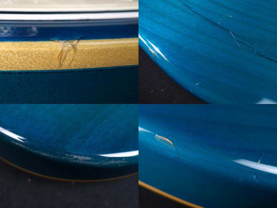 使用に伴う塗装の艶感がネック裏に若干見受けられる他、全体的に使用に伴う細かな弾きキズ/あて傷や打痕、金属パーツのサビやくすみ/メッキ剥げ、