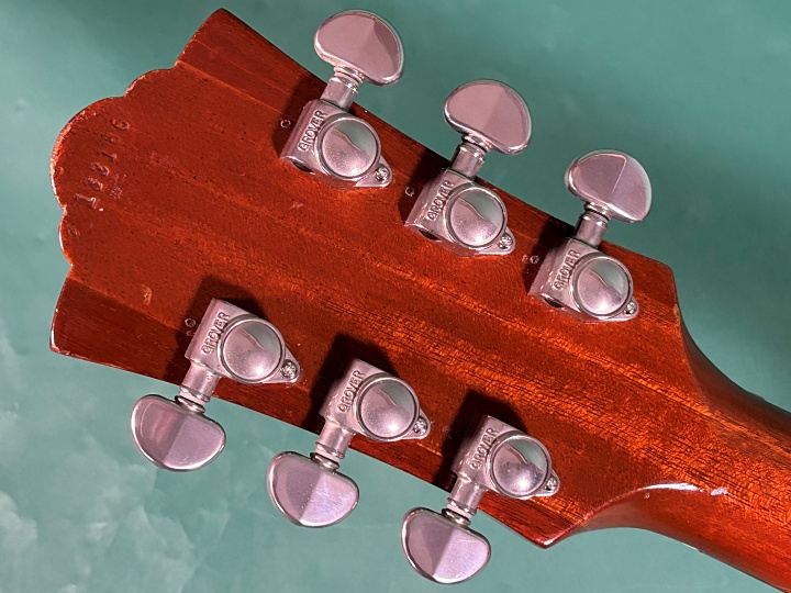 ペグはグローバー102Nに交換されていて動作はスムーズです。前についていたペグのビス穴埋め跡があります。