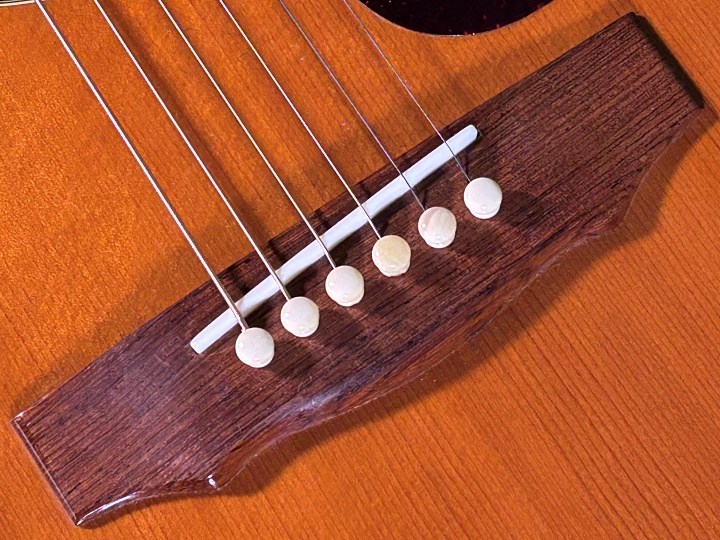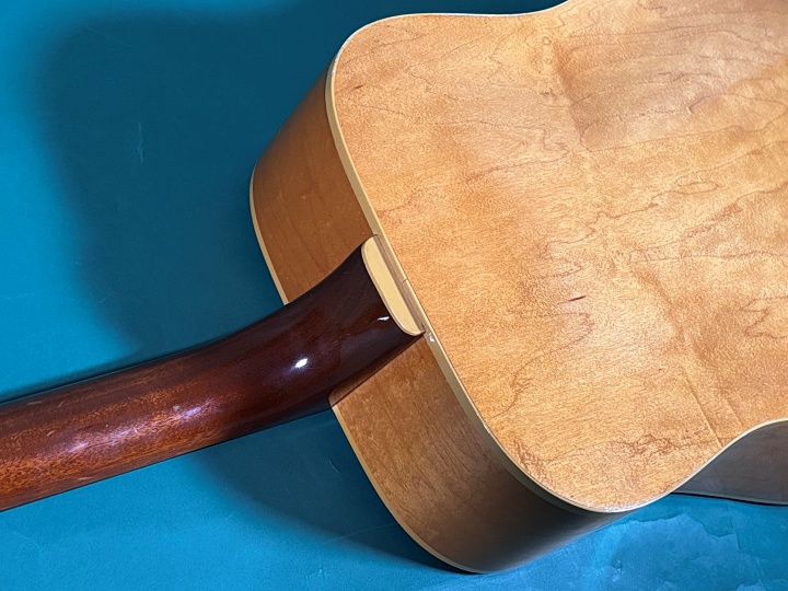 トップはスプルース、サイド、バックはメイプルでアーチバック構造です。指板はローズウッド、ハカランダブリッジです。