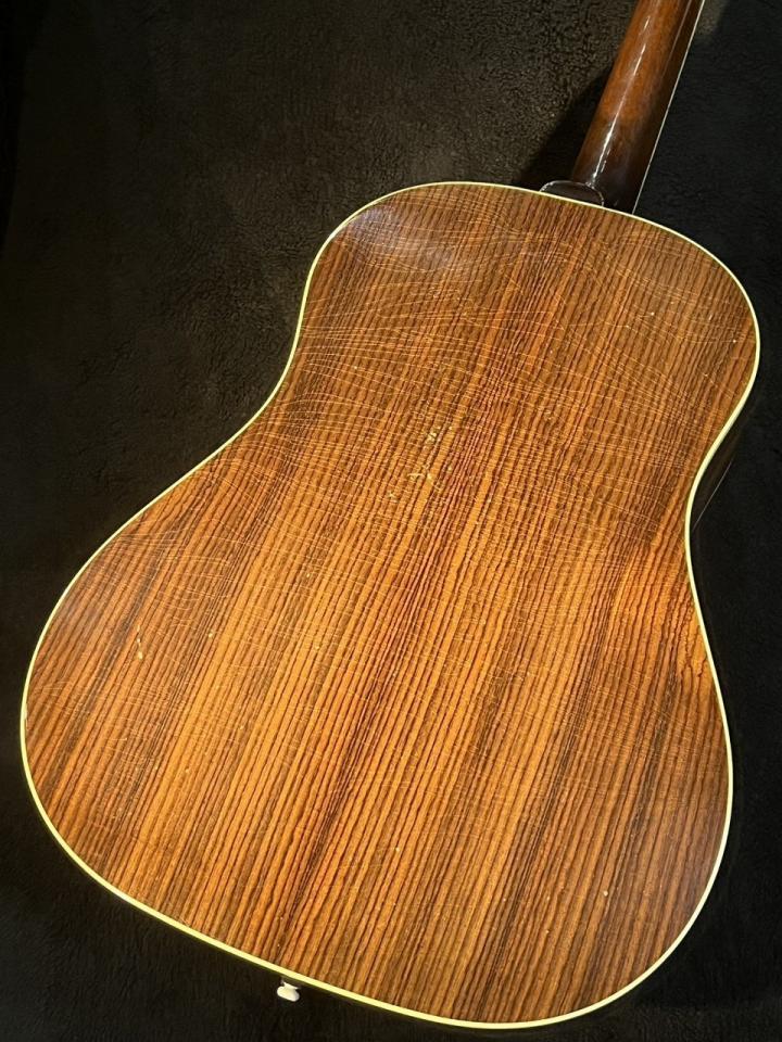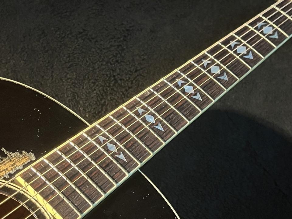 1936年にJ-35と共に世に出たAdvanced Jumbo。1940年に生産を終了し総生産本数は200本程と希少。前モデルであるJumboからの進化モデルとしてAdvanced Jumboと名付けられました。指板上とヘッドのダイヤモンド&アロウインレイは本モデルのみに採用されています。マホガニー、メイプルをサイド&バックに採用したモデルが主流のGibsonアコースティックギターのラインナップの中でローズウッドを採用していたのは戦前のSJ-200と本モデルのみで、良質で美しい杢目のローズウッド材をブックマッチで使用。Gibsonのサウンドに対する真摯な木材選定が窺い知れます。装飾面に触れるとMOPによるプリウォースクリプトロゴにグローバーのV98チューナー、ネックにバインディングを施し高級感の演出にも力を入れていました。発売当初は80ドルであり、D-28の100ドルを意識した価格設定だったようです。J-200同様、Martinドレッドノートスケールに近いロングスケール仕様のラウンドショルダーローズウッドモデルとしての地位を確立したものの、同期のJ-35と比較して高価であったこと、D-28の人気に追従出来なかったことが短命に終わった理由かもしれません。しかしながら希少故に1990年代から何度も復刻されているのはそのポテンシャルが現代において再評価されているのではないかと思わざるを得ません。