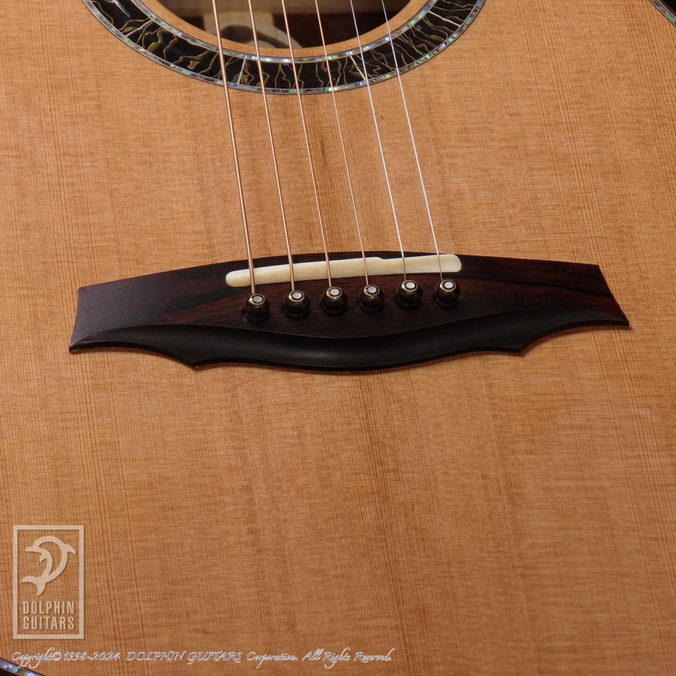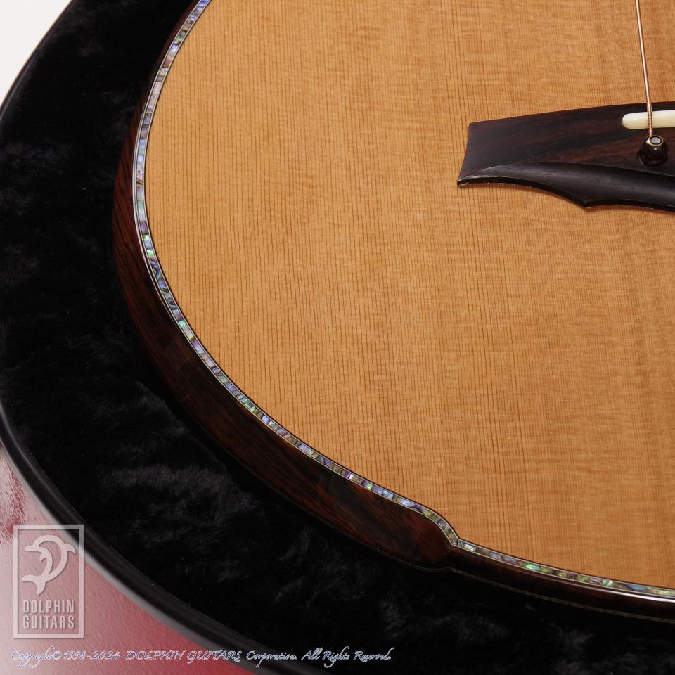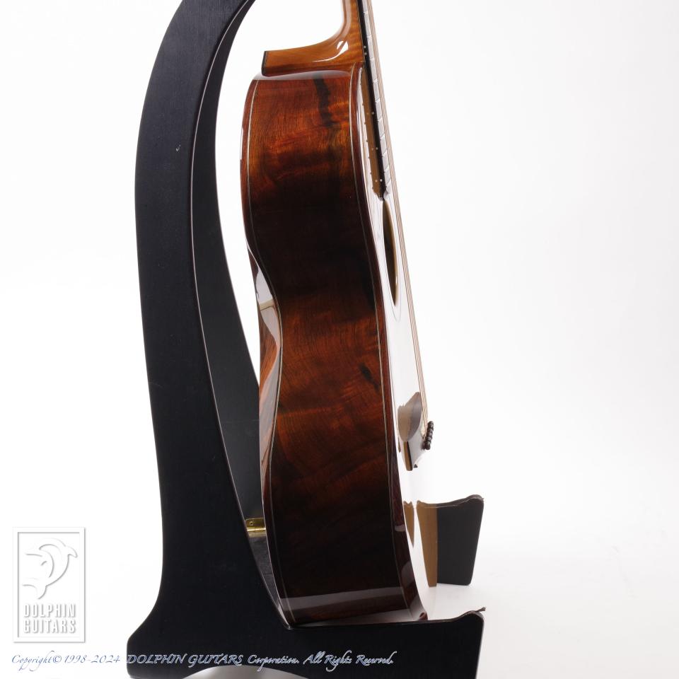 ハカランダのボディ材に、ハカランダのボディバインディング&アームレスト&リブレスト仕様。これはコンパクトサイズのダブルオーの抱え心地をさらに向上させ、長時間の演奏時にもストレスを大きく軽減します。リブレスト(バックコンター)は身体とのフィット感も抜群で、位置や形状が絶妙に作られている点も大きなポイントです。この抱え心地の良さを一度体感しますとこのオプションの重要さも感じていただけるでしょう。