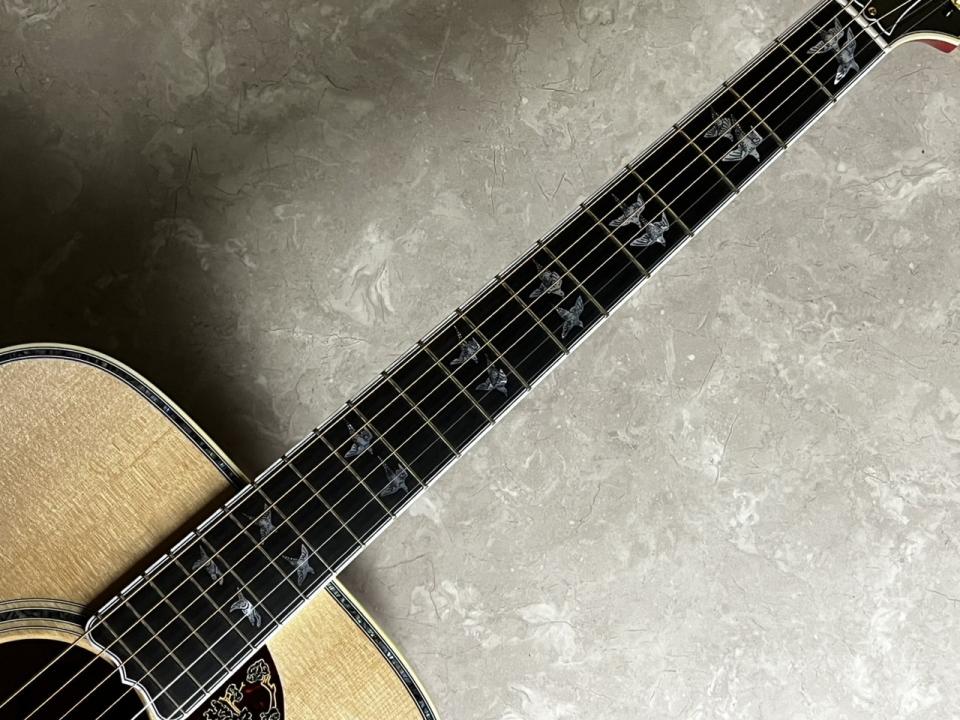 28羽分のエングレーヴされたダヴ(鳩)のインレイが埋め込まれています。ヘッドストック上に7羽、指板上に16羽、ピックガード上に3羽、そしてブリッジベース上に2羽であり、それぞれが別々の表情をしている点が魅力です。