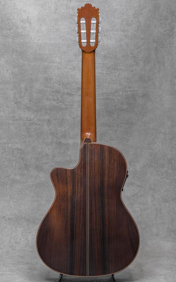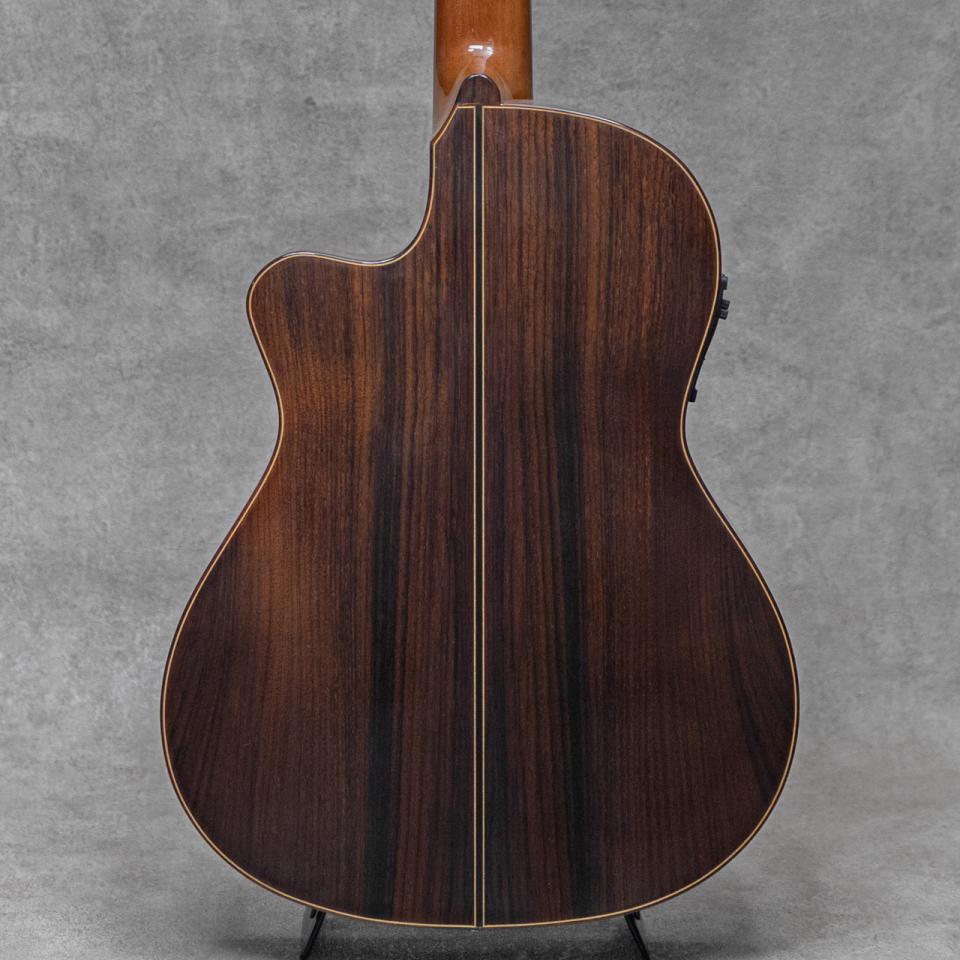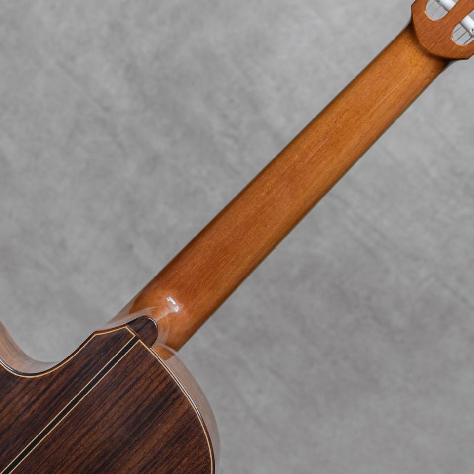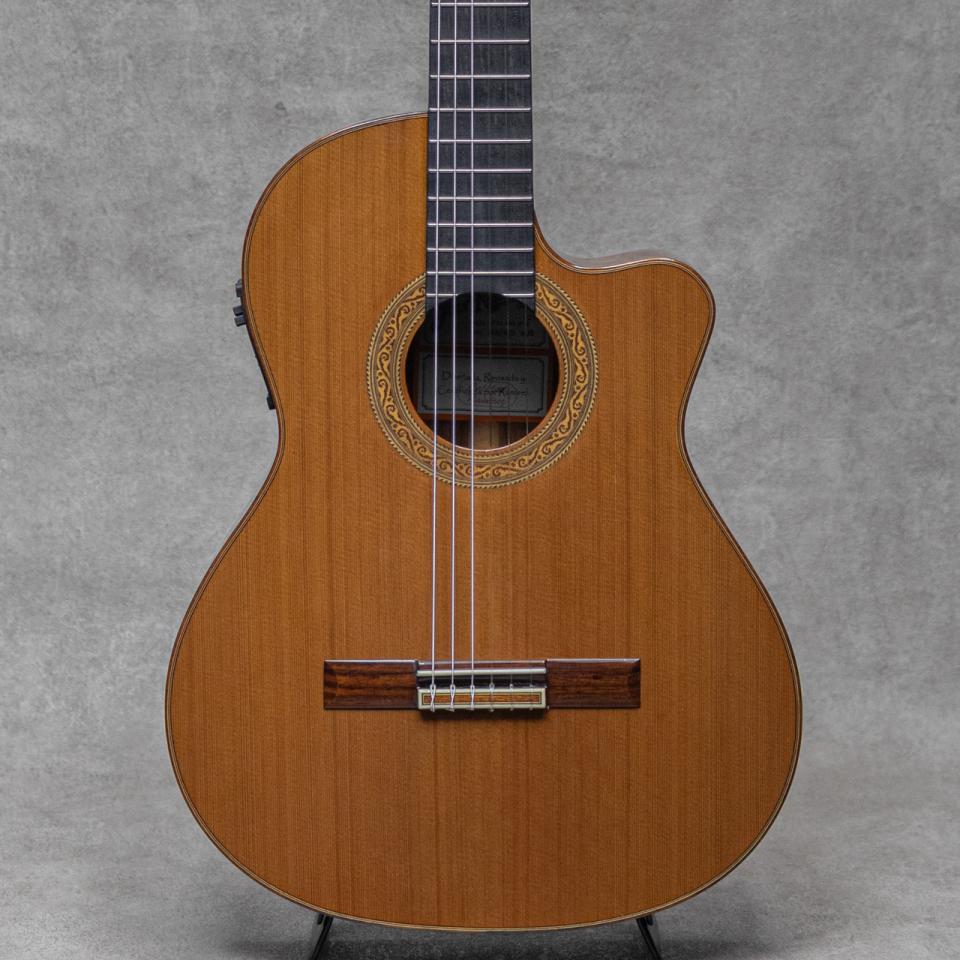 スペイン製クラシックギター名門ブランド"Jose Ramirez(ホセ・ラミレス)"。1882年頃スペイン・マドリードに立ち上げられた工房に端を発し、その後も兄弟、子孫へと引き継がれてきた老舗ブランド。伝統的な高級手工モデルからスペイン国内の専門工場にて生産されるミドルモデルまで手掛け、由緒正しく、広く知られるスパニッシュギターの雄として現在もジャンルの一翼を大きく担い続けています。本器は、幅広い層に向けたエレクトリックカッタウェイシリーズの上位機種"4N-CWE"、2015年製。単板シダートップ、単板ローズウッドサイド&バック、シダーネック、エボニー指板、ローズウッド天神板、ウッドモザイクロゼッタ、ローズウッドバインディング、ローズウッドブリッジ、カッタウェイボディ、Fishman Prefix Pro Blend搭載。大胆なカッタウェイデザインも相まってバーサタイルなスタイルのエレガットながら、下位モデルとは一線を画す単板仕様による豊かな生鳴のポテンシャルを持ったモデル。キレの良い単音単音の粒立ち、レスポンスに優れた反応で豊かな表現を可能にしてくれる高い完成度。PU出力では、アンダーサドルピエゾ+コンディンサーマイクのミックスでナチュラルかつ幅広い出力が可能。クラシックのみならずポップス、ジャズ、ボサノバと幅広くお楽しみいただけます。こちら僅かな塗装面の白濁や極細かな小傷、擦れ程度はあるものの、顕著に気になるダメージは無くクリーンな印象。ネックまわりもグッドコンディションで、弾きやすいアクションをしっかりと保っています。幅広く活躍する本格的なエレガットモデル。ぜひご検討ください。オリジナルハードケース付属