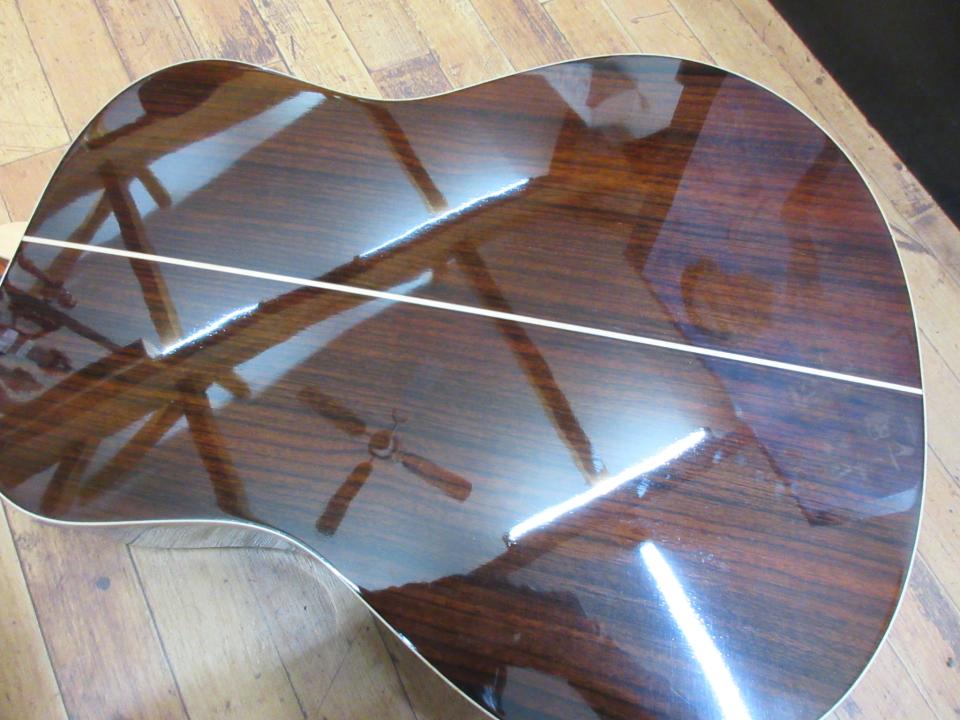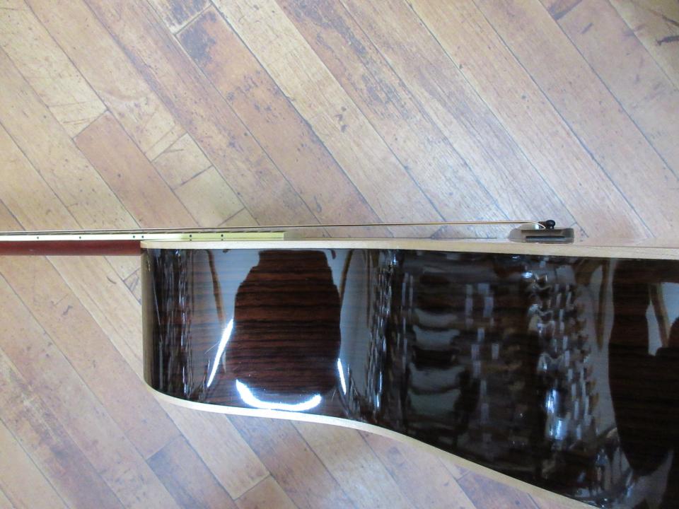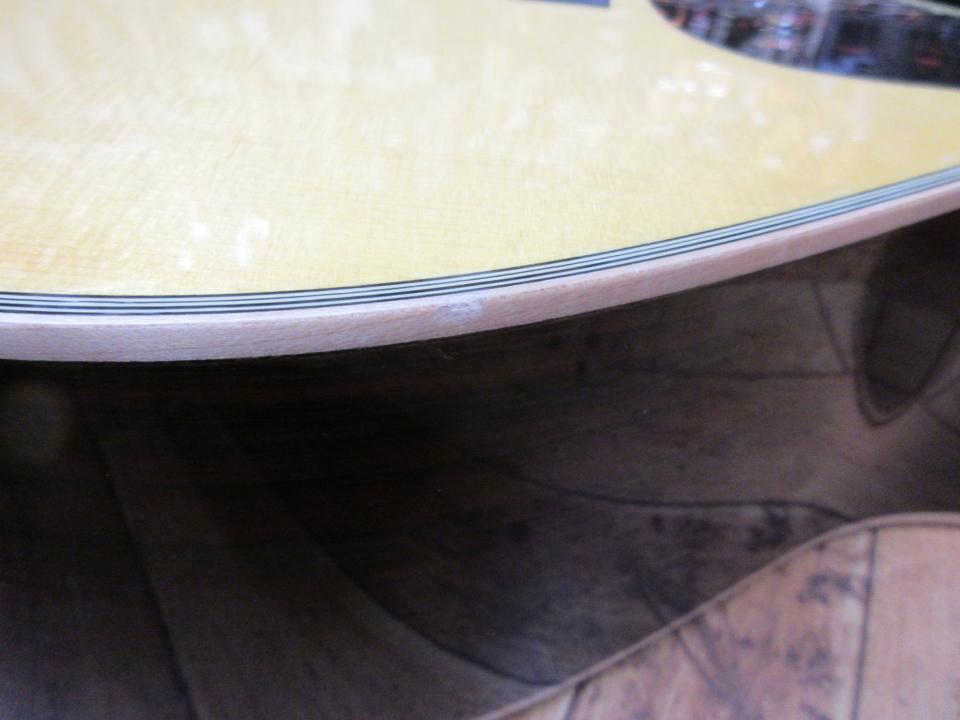 イングルマン・スプルース単板トップ、ローズウッド単板バック&サイド、マホガニーネックにエボニー指板、のオール単板仕様です。BODYサイドのバインディングに凹み(画像参照)があります、BODY全体では、浅く小さな打痕が十数か所ありますが(画像には写せませんでした)、全体的にとても綺麗なギターです。ネックはほぼ真っすぐで、フレットは1~3弦の1~7フレットの範囲に押弦による窪みがありますが、演奏に支障はありません。
