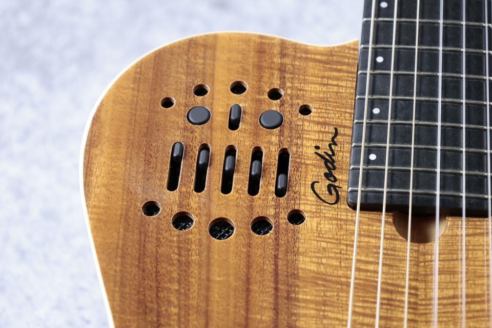 Godin独自の13ピンアウト端子から、ローランドGRシリーズ等のギターシンセへ接続することが可能です。トップに配置されたコントロールでピックアップからの出力と外部音源からの出力をミックスする事も可能で従来のギターサウンドの領域を超えた多彩なサウンドメイクが可能となっております。