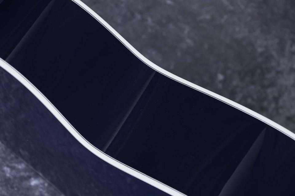 深い海の中を思わせるようなブルーがボディの中心を境に繊細に表情を変えていく様は芸術品のような美しさで光の角度によってもやや表情を変え、様々な輝きを見せてくれます。