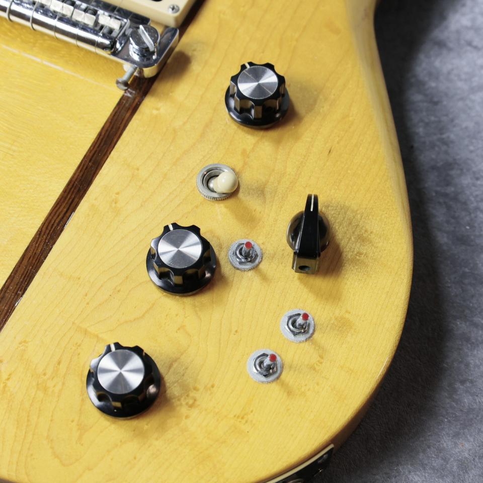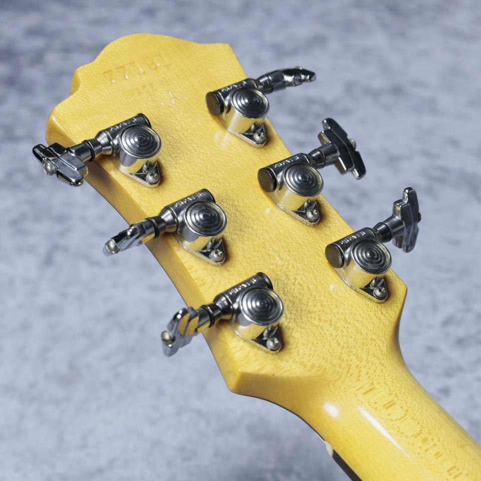 しかし、こちらの個体は赤ピンスイッチ、フロント、リア兼用のシリーズ/パラレルスイッチ、渦巻きバックのインペリアルペグ、ヘッドのRロゴ左側の真中の突起などから1977年製と思われます。(シリアルも77から始まるものです。)