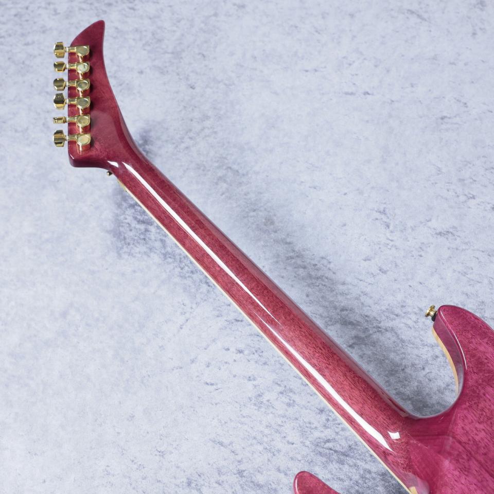 特徴的なオリジナルシェイプのボディはフレイムメイプルトップのマホガニーバック仕様。