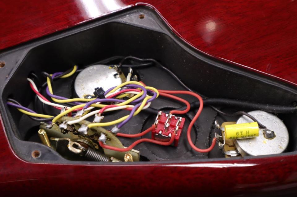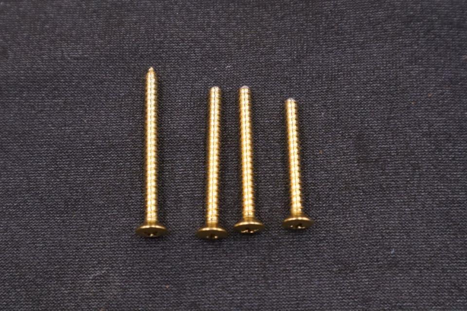 ブリッジはSCHECTERお得意のブラスを削り出したものが採用されております。ブラスはあえてメッキされておらずサウンド面を優先したものと思われます。1980年代はこの手のブリッジサドルが流行りました。ちなみにこのブリッジは裏通しになっており、ブリッジプレートにも弦通り穴が開いているのですがなぜかサドルのピッチと合っておりません。6弦側に合わせてあるため1弦は穴半分ほどずれております。機能上は問題ありませんがいかにもUSA製だなと感じる一面です。ネック取り付けビスはスラントジョイントのため各部でビスの長さが異なります。近年ではロングビスとショートビスをそれぞれ用意することが一般的ですが、こちらはロングビスを手作業で加工して長さを調整しております。このビスがオリジナルかどうかは定かではございませんがこの手の加工も以前は多くみられました。