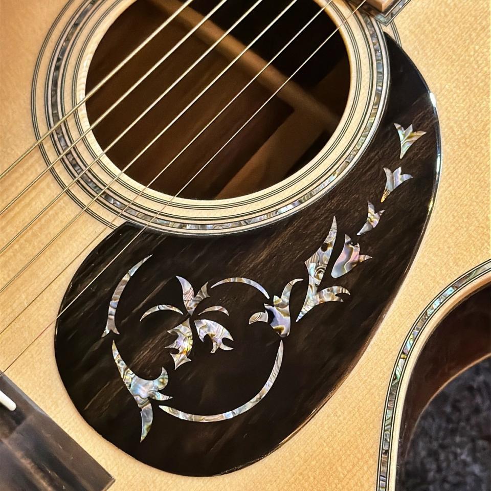 【当店限定特典付き】華やかなエボニー・フローラルインレイ・ピックガード、バインディングやロゼッタ等の細部に至るまで、可能な限り自然素材を使用したことで人工素材では表現できない質感と温もりが際立つ一本!