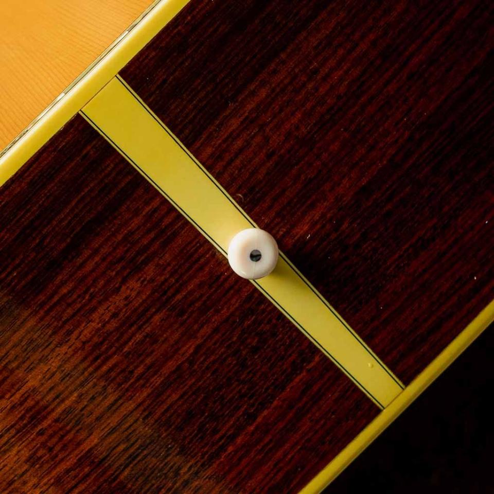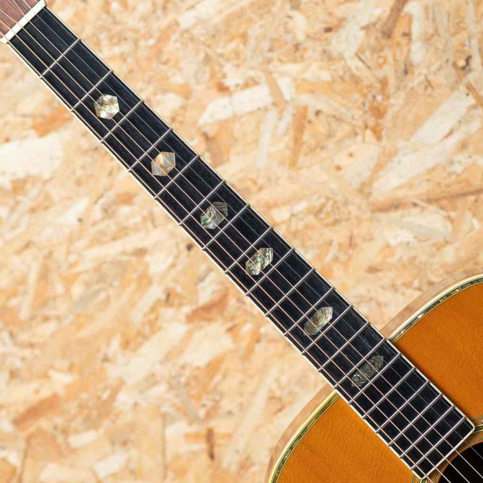 "D-41"はマーチン社の広報/研究家マイク・ロングワース氏によってデザインされ、1969年に製作が開始されたモデル。数が少なくて高価なD-45を探すよりもD-28に飾りを付けたいという需要から生まれ、28と45の中間モデルとして独自の個性を持ったモデルです。本器は1972年製のUSED品。ジャーマンスプルーススプルーストップ、インディアンローズウッドサイド&バック、マホガニーネック、エボニー指板&ブリッジ、オリジナルUSA GROVERゴールドペグ、アバロンインレイロゼッタ&トリム、D-41スタイルヘキサゴン指板ポジション、バーチカルヘッドロゴ、スクエアーロッド、ノンスキャロップドXブレイシング。ピックガードはべっ甲柄の物へ交換されています。登場より1974年まではジャーマンスプルースがトップ材に使用されており、翌年以降のシトカスプルーストップ物とは一線を画した評価です。40番台はフォークブームの最中には憧れの象徴として非常に人気を博しましたが、舶来モノとして非常に高価であったことから手に入れられなかった方も多い機種。見た目の絢爛さ、上品なサウンド、いつかはマーチンを胸に機会を窺っている方もおられるでしょう。粘りを含んだ太く甘い立ち上がりはジャーマンスプルーストップでしか体感できない感覚で後年のシトカスプルースとは一線を画します。ノンスキャロップドXブレイシング、SQロッドだからこその芯の強さ、音色の太さを獲得しており現代のモノとは特にロー成分の豊かさにおいて違った個性を発揮しています。ネックヒール横にストラップピンの取付、ピックガード下部からピックガード下に掛けてクラックの補修があり、内部から補強も当てられています。サドルはギリギリまで低く調整されていますが、弦高はやや高めです。トップ全体にまんべんなくウェザーチェックも出ており良い雰囲気が出ています。その他傷・打痕などは見られますが年代を考慮するときれいな状態が保たれており大切に使用されていたことが伺えます。ジャーマントップの45はすでにお手にするにはかなり難易度の高い価格に達している事を考えると代わりとなり得る41は選択肢としてはアリではないでしょうか。オリジナルマーチンブルーケース付属です。