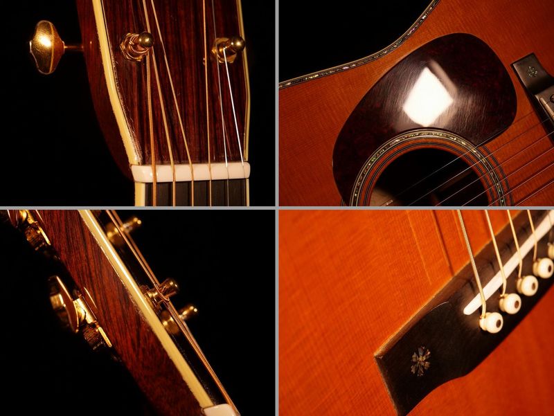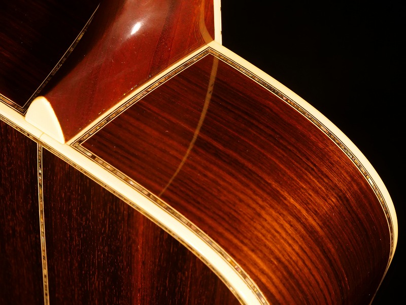 トップにプレミアムグレードのシトカスプルース、サイド、バックにインディアンローズウッド、マホガニーネック(AJロッド)、エボニー指板、エボニーブリッジ、マーチン刻印が入ったオープンバックペグ、ポジションマークにはスノーフレイクインレイ、アイボロイド指板&ボディバインディング、トップ・トリム、ロゼッタ、指板サイドにはアバロンが施され、エンドピース部分のBOXインレイ、指板エンドにはCFマーチン一世のサインインレイが施されている豪華な仕様です。