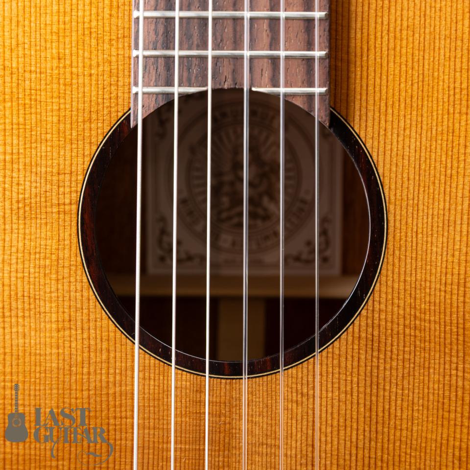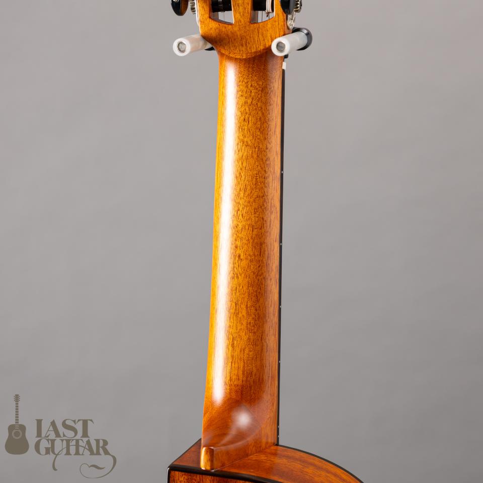 ウッドマテリアルにつきましては、シダートップ、マホガニーのサイド、バック、ネック、ローズウッドのフィンガーボードとブリッジです。ネックまわりは、ナット幅は、46ミリで一般的なクラシックギターより狭く、程よい厚みで馴染みやすいと思います。フィニッシュは、さらさらとした手触りの艶を抑えたセミグロス仕上げで木の温もりが感じられます。またペグのベースプレートは、千鳥柄が入っていて可愛らしくこのシリーズのポイントになっています。