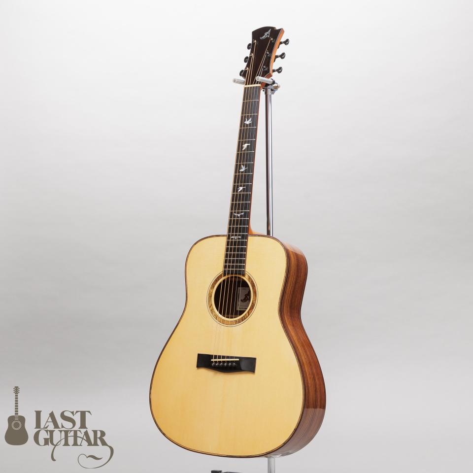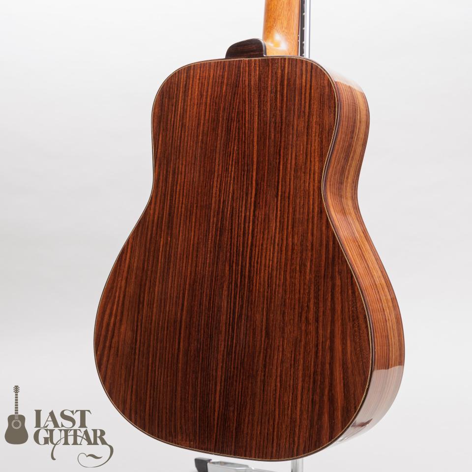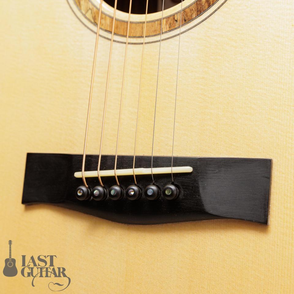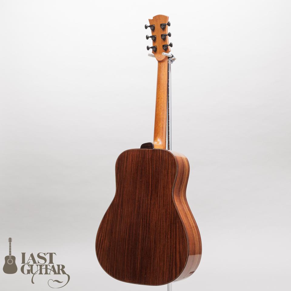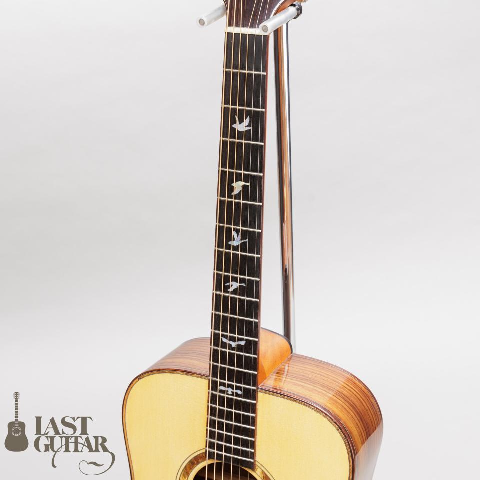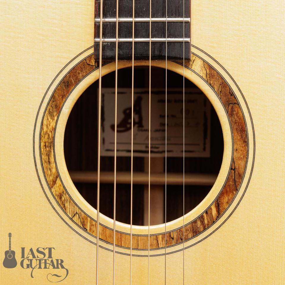 本機は、有満氏がもっとも自信をもつボディシェイプで、AMDと呼ばれるマーティンよりも少しだけ小振りなドレットノートタイプです。塗装は、木の鳴りを極力損なわないために、ほぼシェラック塗装で、最終コーティングのみラッカーで仕上げてあります。それにより独自の振動感と倍音の響き、リバーブ感を生み出しています。ロゼッタやバインディングなど雰囲気あるウッド系でまとめられた落ち着きあるルックスの中で、アリミツギターの代名詞であるバードのフィンガーボードインレイが美しい輝きを放っており、作家モノらしいディテールも存分に味わうことができます。