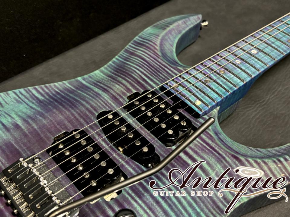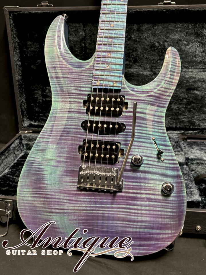 まずその驚愕のスペックとして、採用された材は全て厳選された最高峰となるAAAAAグレードのフィギュアドフレイムメイプルを使用したオールメイプルボディ&ネックとなりますが、こちらは大変希少な一枚板から削り出した贅沢極まり無い一本。ボディにはDSTシリーズ初となるアーチ状に削り出されたカーブドトップを採用。ネックは所謂貼メイプル仕様となっており、ボディ&ネック共に余すことなく強烈なフィギュアドフレイムが浮かび上がります。またフィニッシュカラーも全てマッチングにてマジョーラカラーを彷彿させるブルー系やパープル系の混在する美しいカラーリングが採用されており、フィギュアドとのマッチングはもはやギターの枠を超えた芸術品としての仕上がりとなっております。その他としては、ブリッジにはアンカー式2点支持、スティールサドル&ブロックのGotoh 510TS-FE1、パールボタンのGotoh SG381-P7,MG-Tロッキングチューナー、Jescar Medium Jumboステンレス24F仕様、300Rラディアス指板にはアバロンドットマーカー、フレットサイドは丁寧なロールド処理、独自のヒールレスカット、4ボルトのプレート・デタッチャブル、もちろんバズフェイトンシステムもインストールされております。またオールメイプル仕様とロックな仕様ながら、総重量は約3.64kgと信じられない程に軽量である点も、採用材のグレードの高さが伺えます。