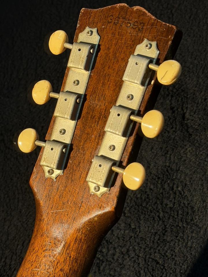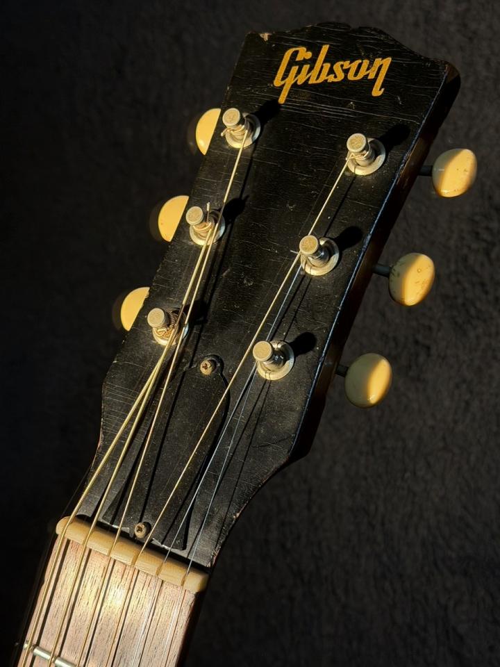 1963年~1971年までの短い生産期間で市場に出回る機会の少ない1965年製F-25 Folksingerの入荷です。LGシリーズと同サイズのスモールボディで12フレットジョイント。ヘッド角14度、ナット幅約50mmでサウンドホール両脇に白いゴルペ板。指板はガットギターのようにフラット。フォークとクラシックが癒合したようなGibsonらしくない(?)スペックがマニア心を擽ります。1965年途中より全モデルがナット幅約39mmのナロウネック時代に突入する中、本モデルの存在は極めて謎...ブレイシングはXになります。