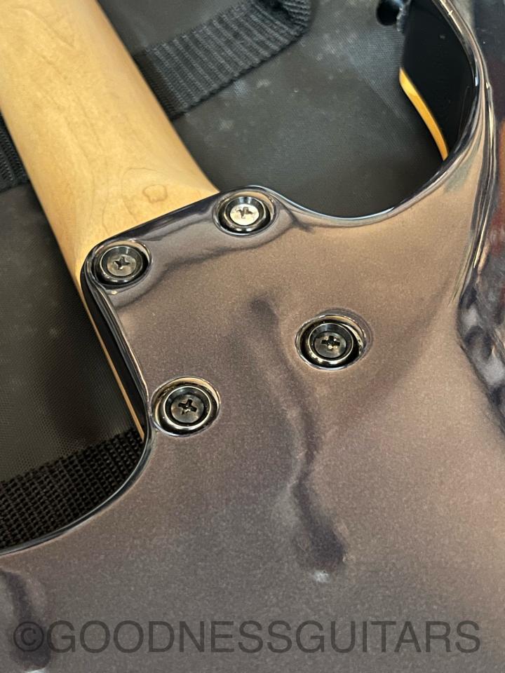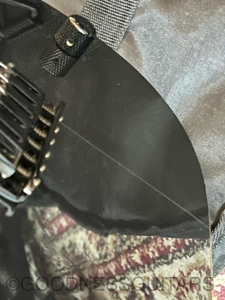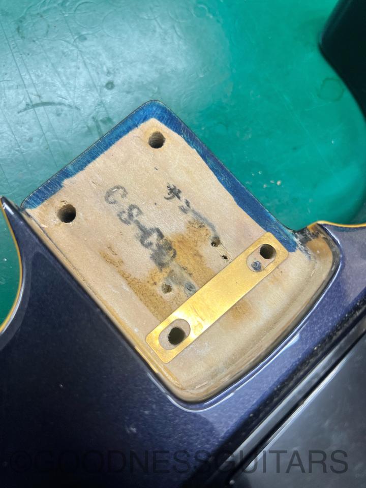 1弦側ボディエンドにかけて塗装のやせとクラックが見受けられます。なぜかジョイントビスが一本だけクロームカラーでした。