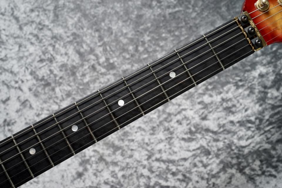 ネックにも美しいバーズアイメイプルを使用し、密度や艶、色味も黒々しく素晴らしいエボニー指板と、