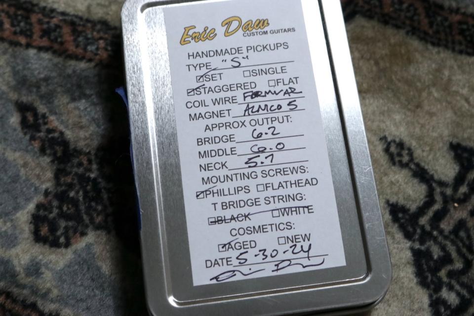 そして当店ではこちらの商品のピックアップを「Eric Daw」のストラトキャスター用(エイジド)に交換しています。カスタム・ピックアップの製作で知られる、アイダホのギター職人「Eric Daw」氏によるハンドワウンドピックアップ。1950年代のエレキギターの先駆者たちの初期のピックアップ巻線装置を研究して作ったダイレクトドライブ・ピックアップ巻線装置で、一つ一つ手作業で巻かれています。2024年5月30日製造の新品です。