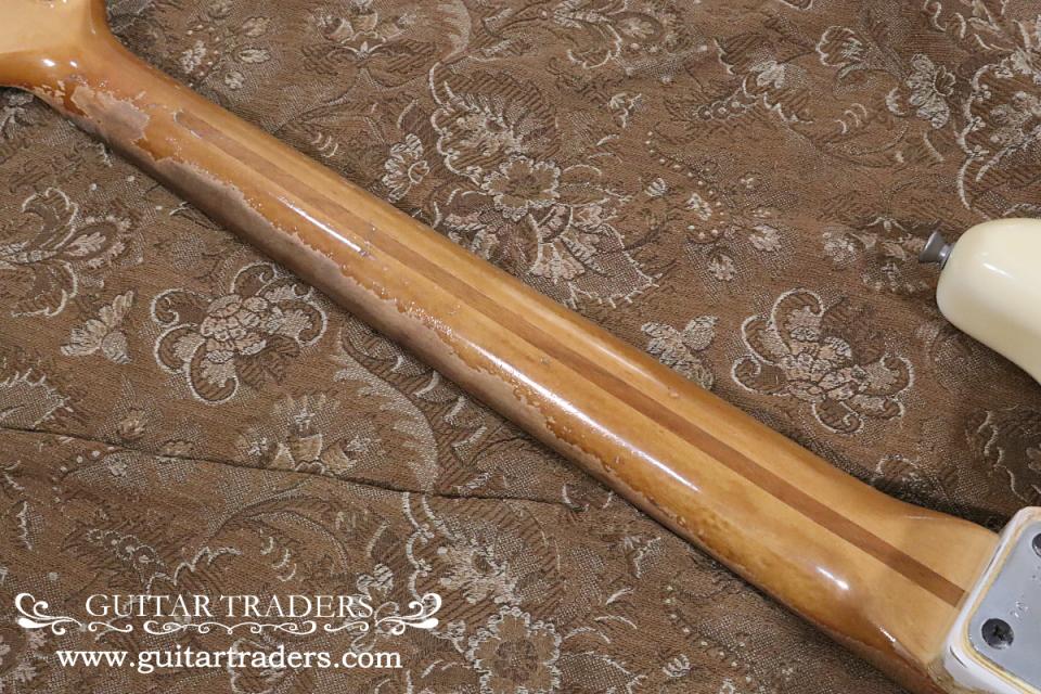 外観は、このカラーの宿命でもある、オリンピック・ホワイト・フィニッシュ上のクリア・トップコートのイエローニングは見られますが、ヴィンテージ・ギアと考慮しますと、まずまずのコンディションで、ネック裏側にもプレイによる、塗装の劣化した部分がみられます