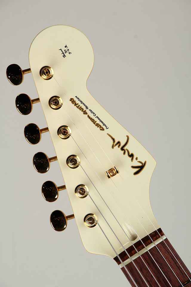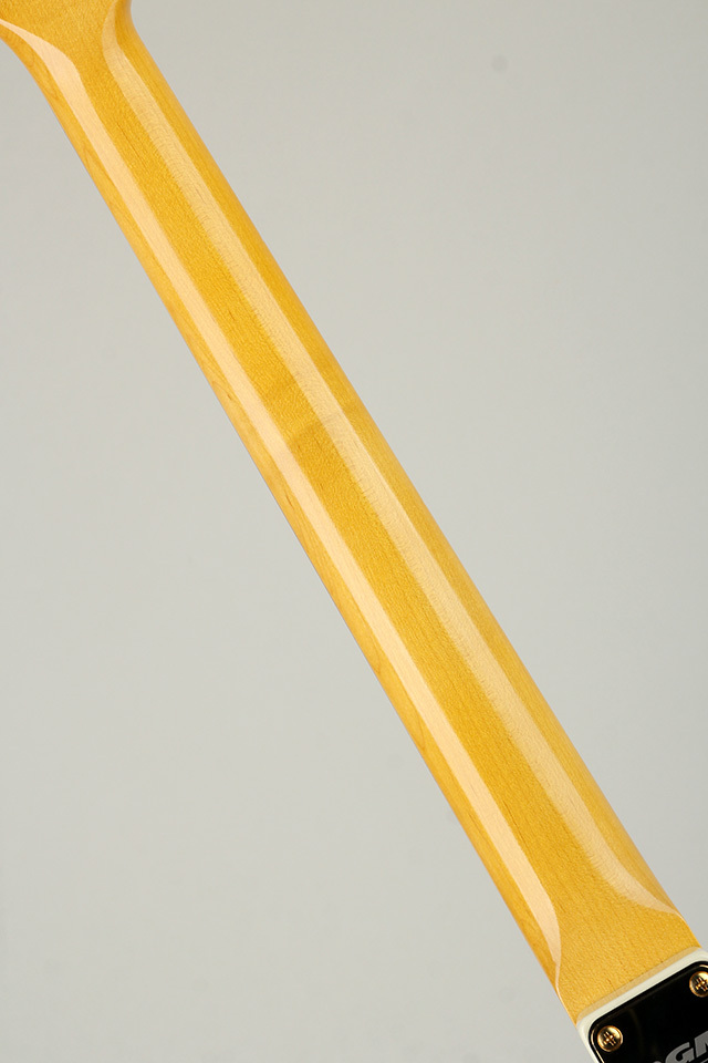 本器はアルダーボディにメイプルネック/スラブボード、パーチメント3plyピックガードを採用した60年代中期スタイルの一本。厳選された木材と厳密な組み込み、極めて薄いラッカー塗装による生鳴りは圧巻の一言です。